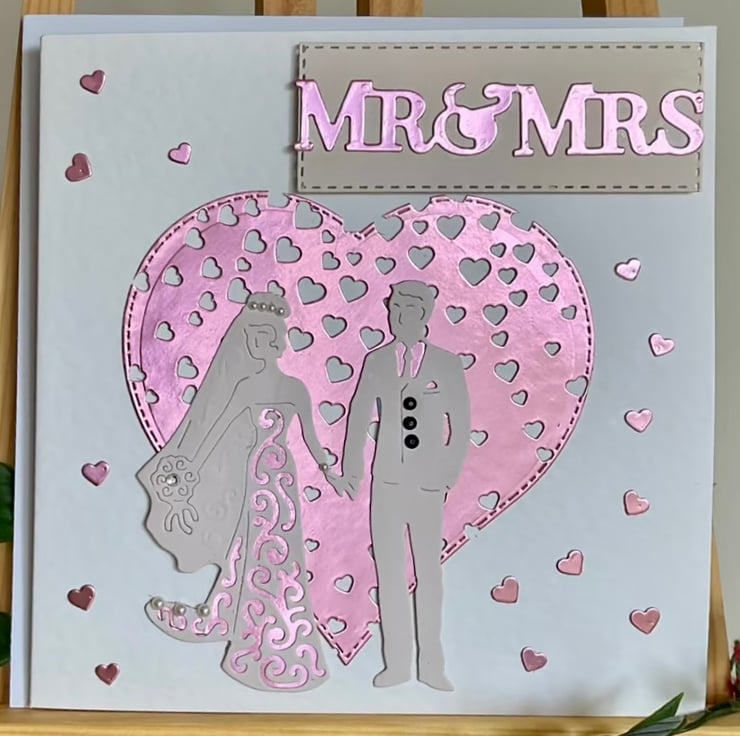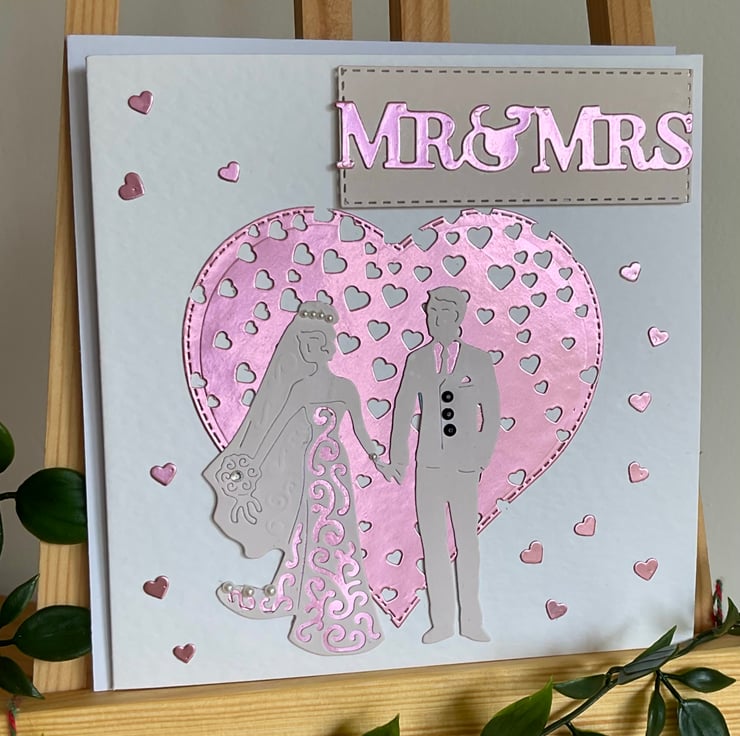 The word Mr and Mrs have been die cut from rose gold card and applied to a 3D ivory base.