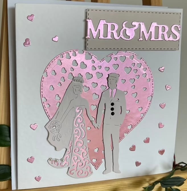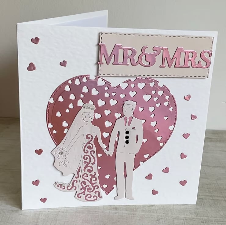 A heart made from rose gold metallic card has been die cut with smaller hearts and applied to a hammered white card base. This has been layered with a bride and groom that have been embellished with faux gems and pearls.