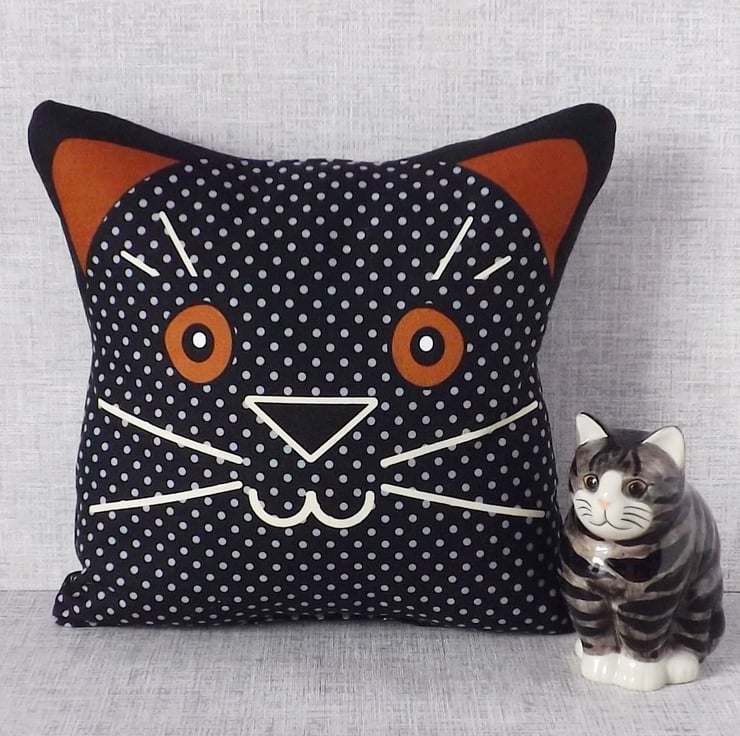 A small accent cushion made from cotton fabric with a black cat's face on the front, and tail on the back.