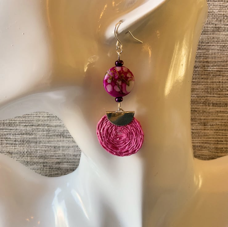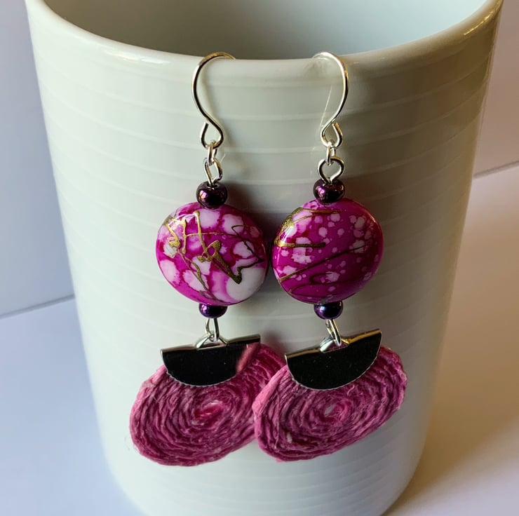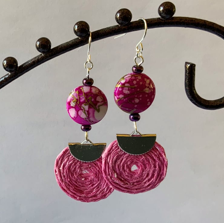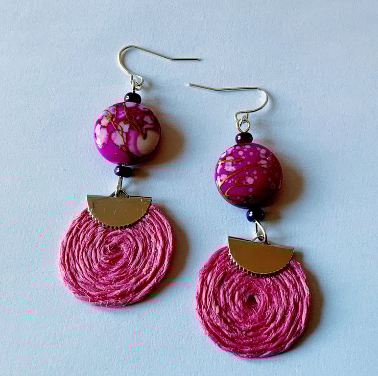 featuring hot pink mottled beads and mini purple glass rochhels on Silver plated ear wires, alloy and nickle free.