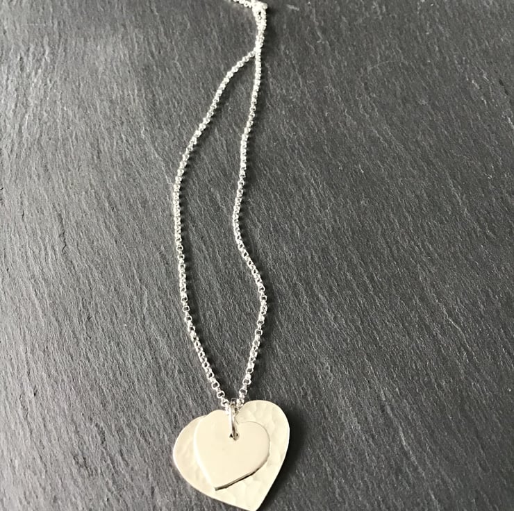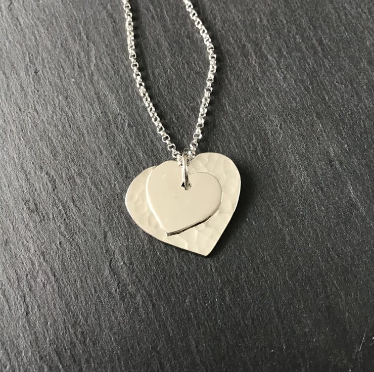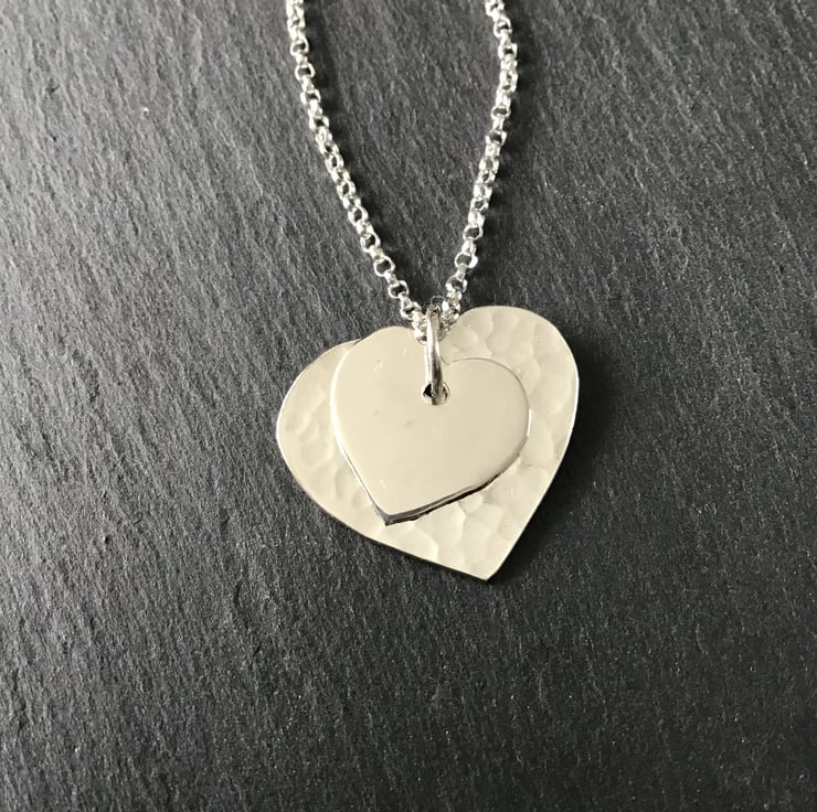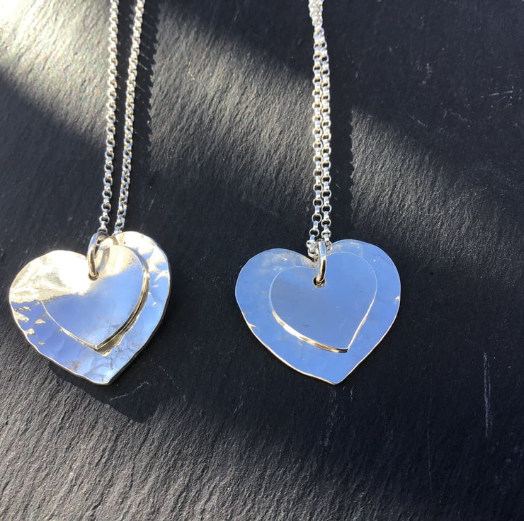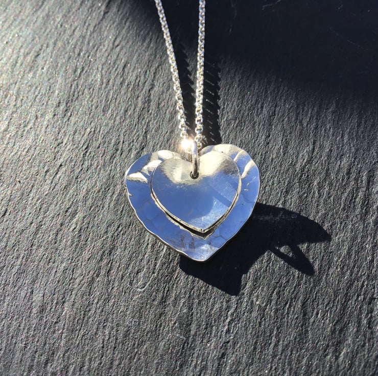 Classically elegant the heart is used as a symbol of love and affection and makes an ideal gift to loved ones. In this design the hand cut, hammered, silver heart is paired with a smaller, highly polished hand cut heart that enables the light to reflect off the piece beautifully.