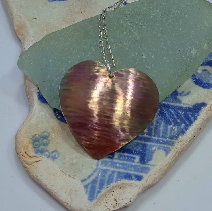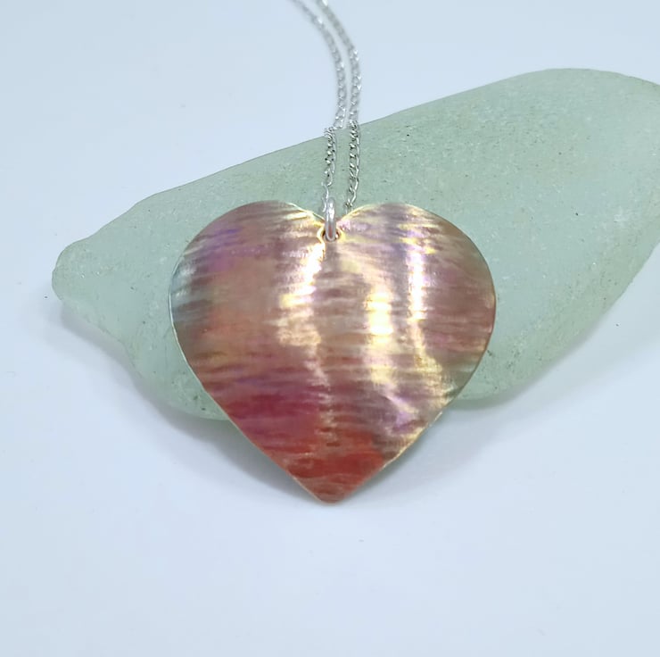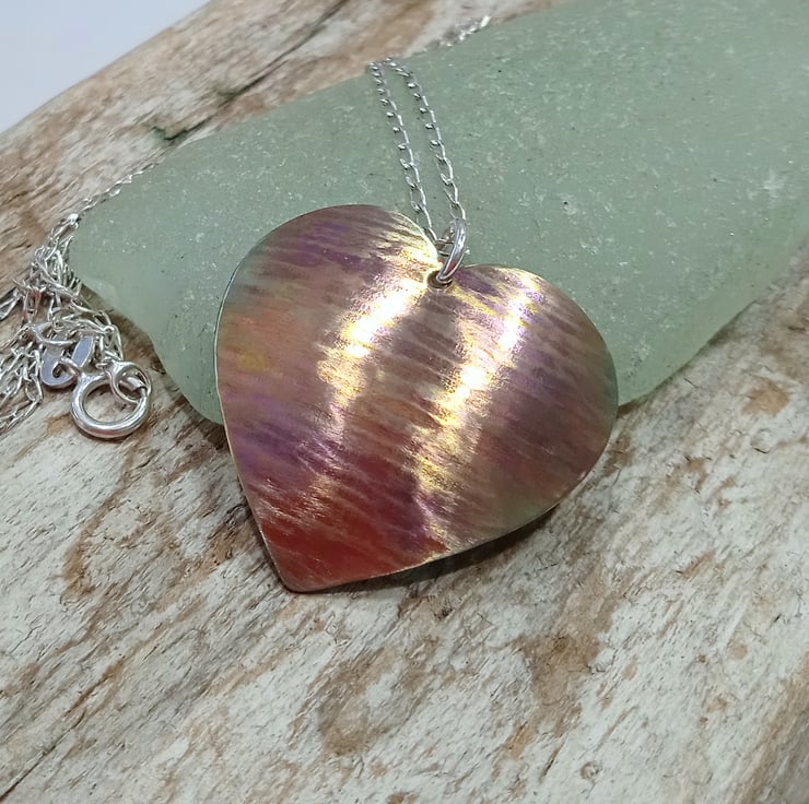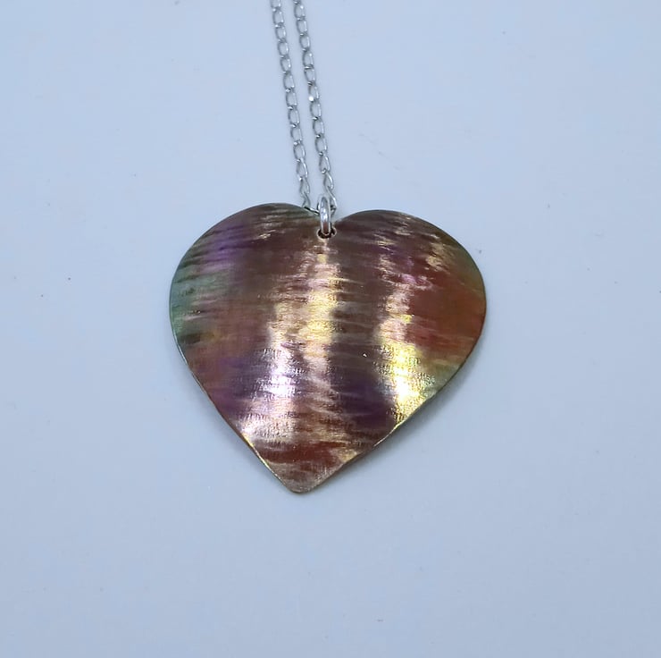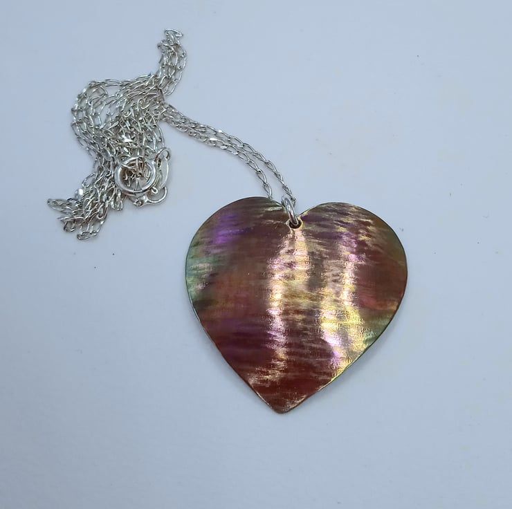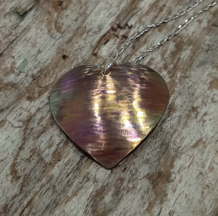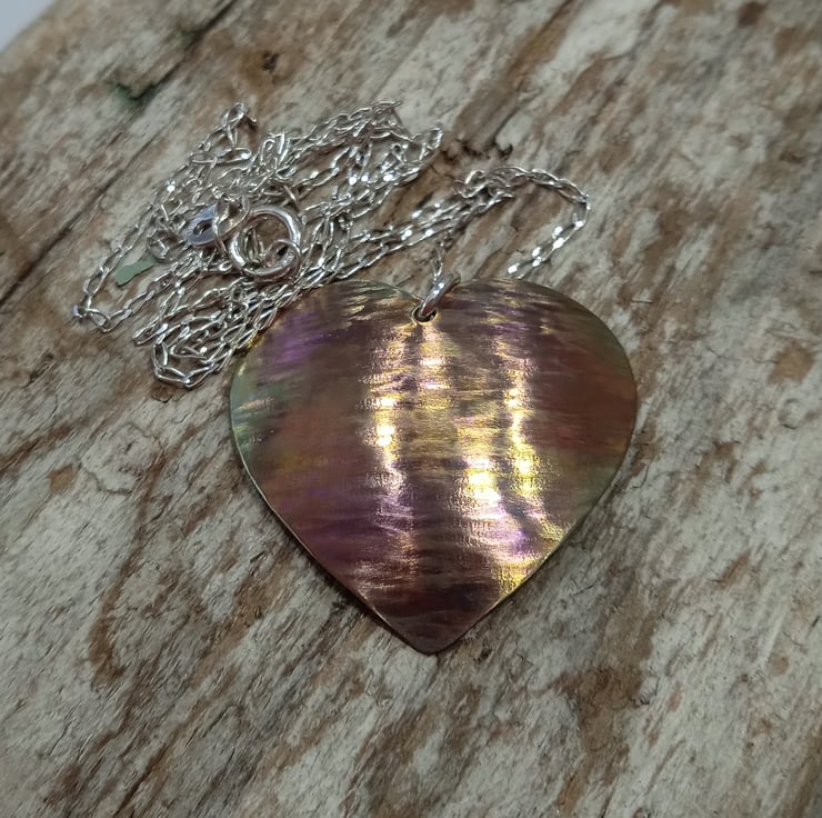 I have hand sawed the heart from titanium sheet and carefully filed and sanded it. I have then hammered it to apply texture before doming it to create an interesting shape then polishing and colouring via a two stage process.
