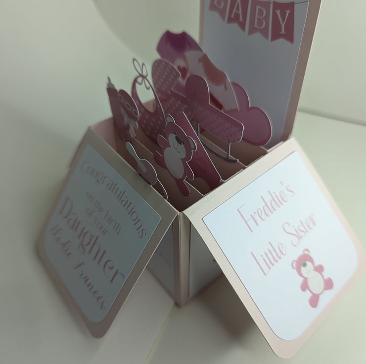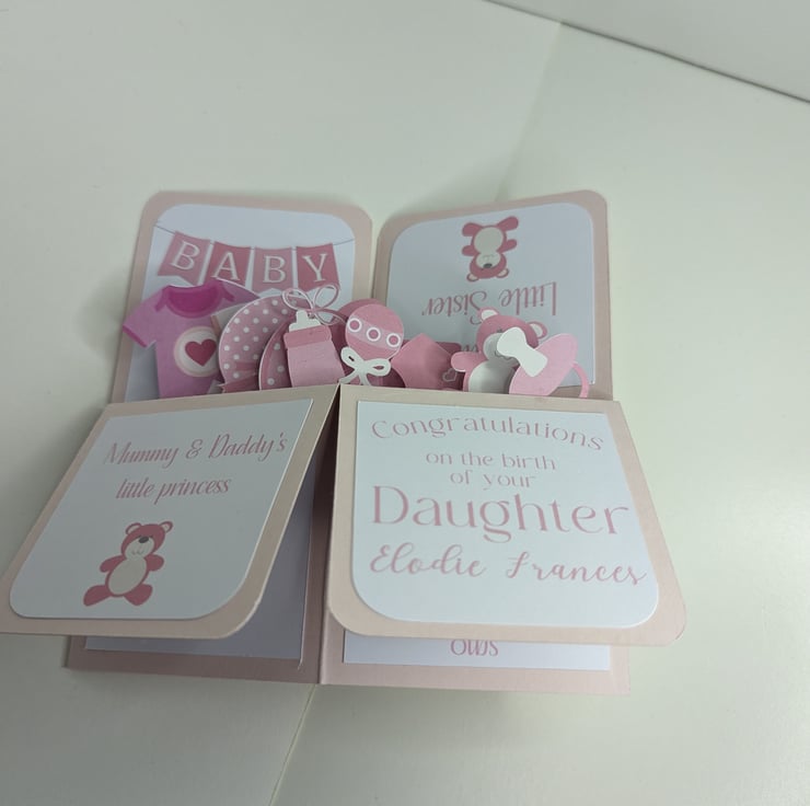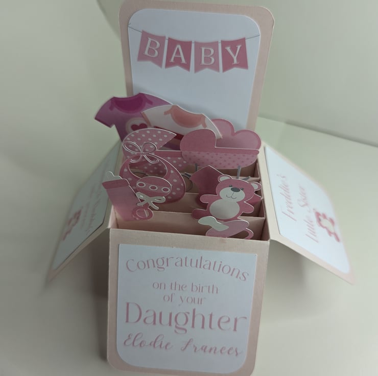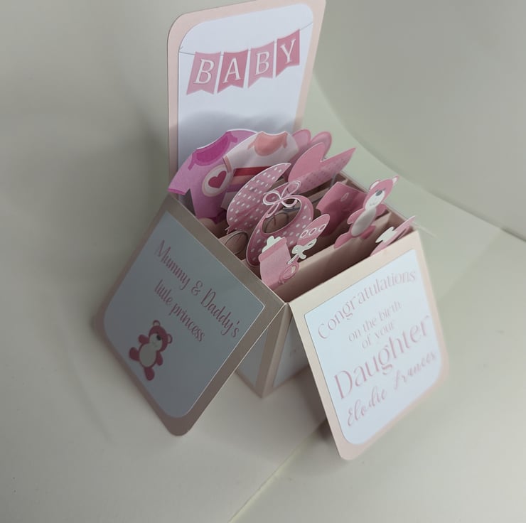 A pink box card base has been decorated with die cut baby items and toys. The front panel has a message "Congratulations on the birth of your daughter". This can be altered to include the baby's name and or the date of birth.. Please answer the questions when ordering.