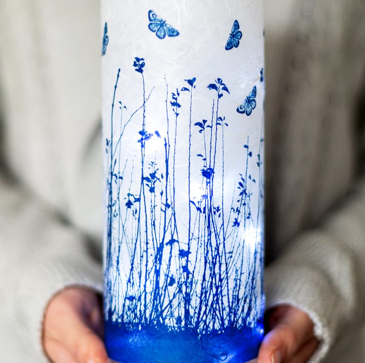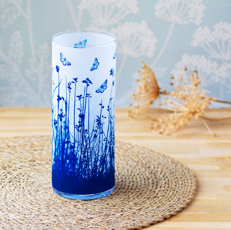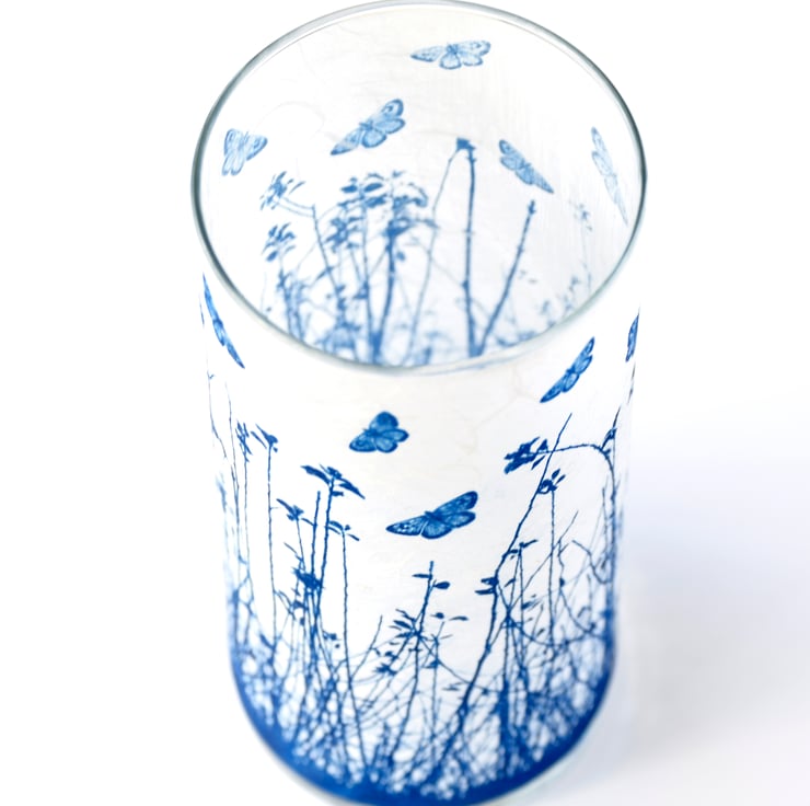 A large cylinder vase with semi translucent blue butterflies fluttering above a meadow. Created using the Cyanotype technique on a textured paper then applied to glass.
