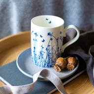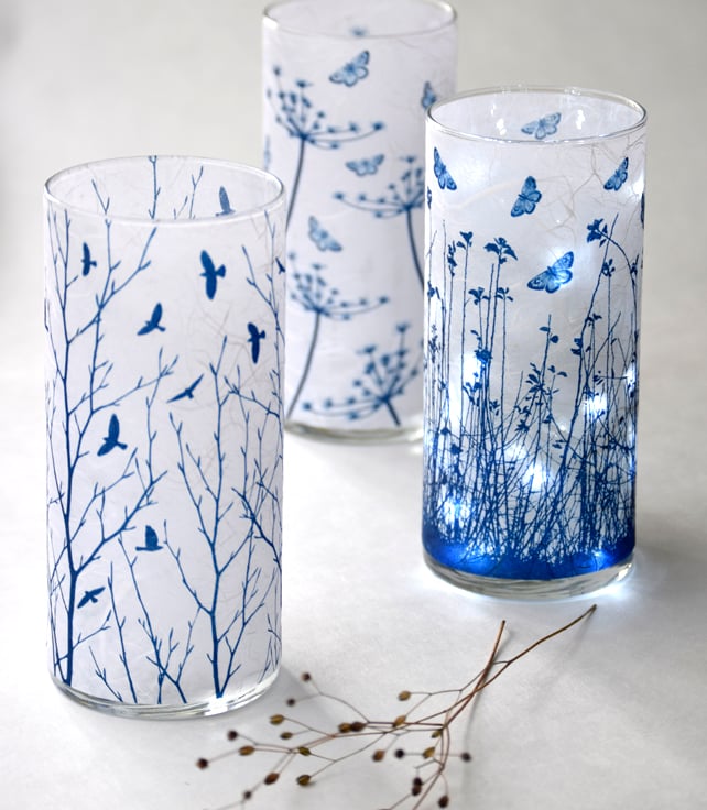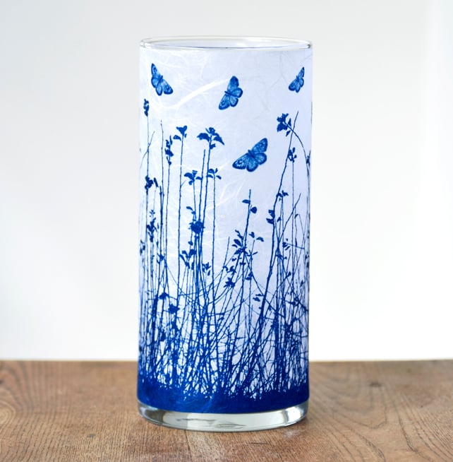 A large cylinder vase with semi translucent blue butterflies fluttering above a meadow. Created using the Cyanotype technique on a textured paper then applied to glass.