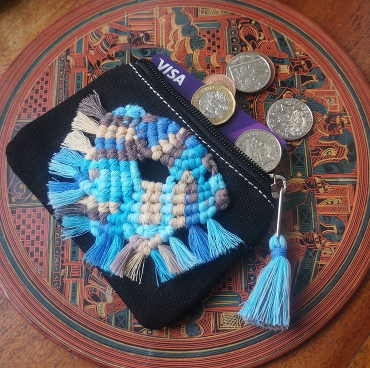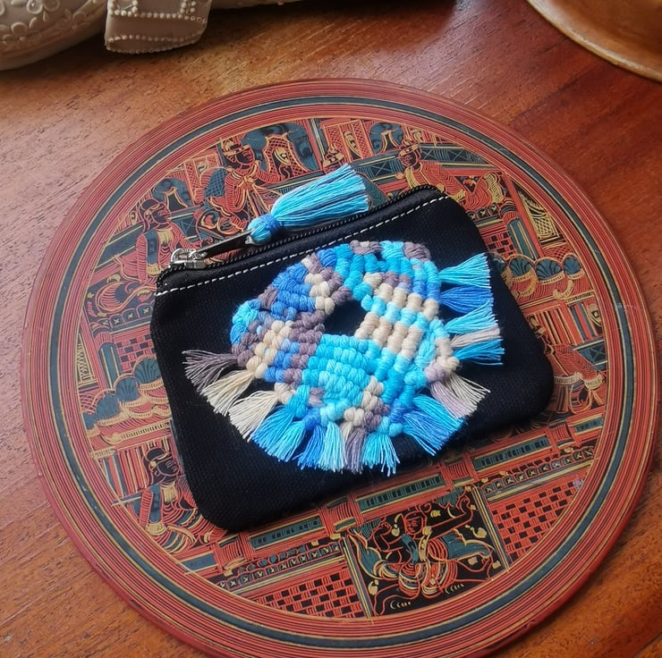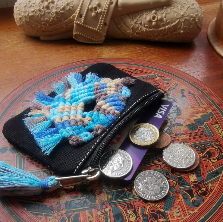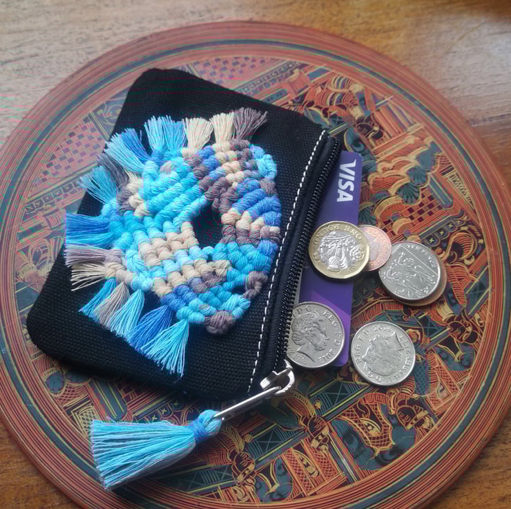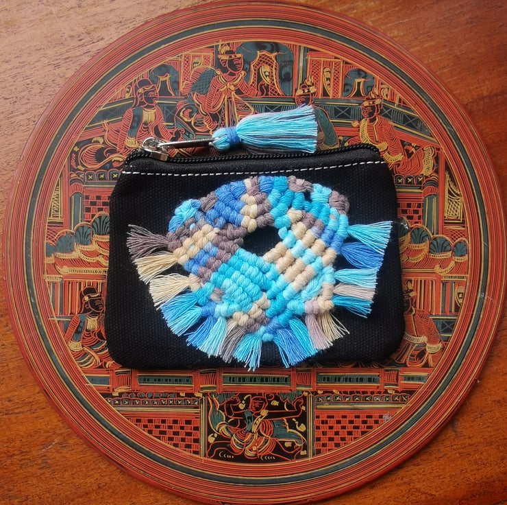Cotton purse with a zip and tassel decorated with macrame cord.