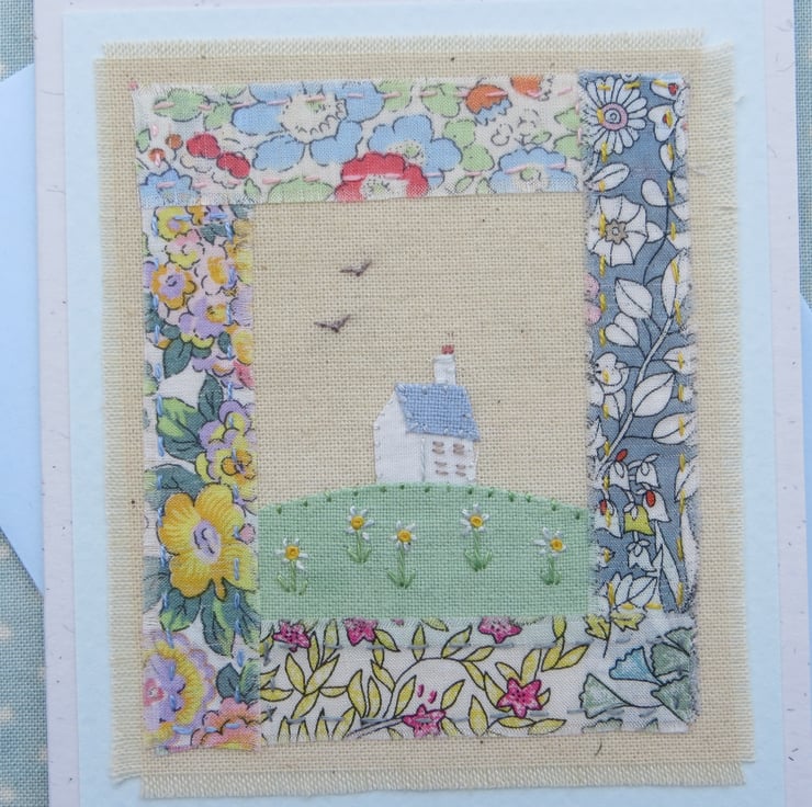 This is a small hand-stitched textile mounted onto a greeting card. I have hand-stitched everything with care and used a pretty Liberty cotton prints for the border. The miniature applique is made with my own hand-dyed recycled cotton fabrics with finely embroidered details.