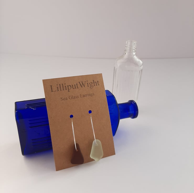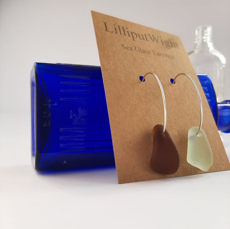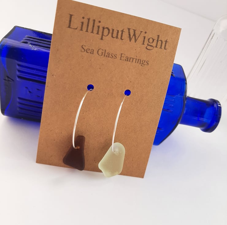 The silver hoops are 1 1/4" in diameter and each has a piece of sea glass threaded onto it, one brown and one white in this mismatched pair.
