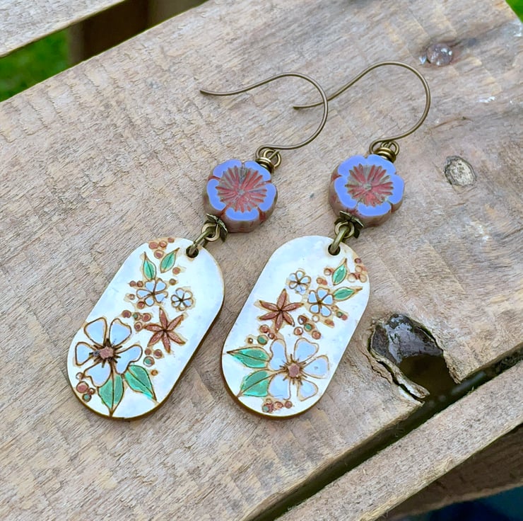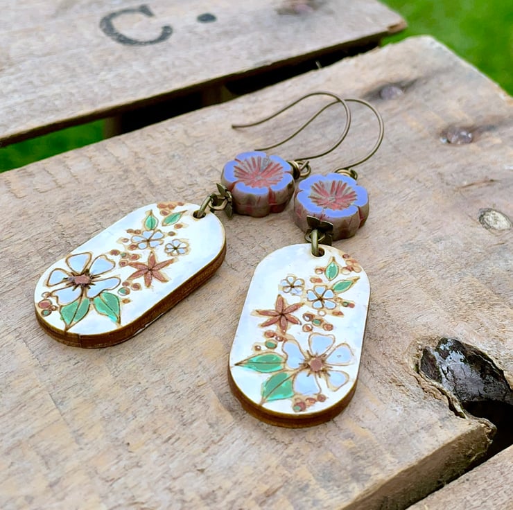 Lightweight hand-painted wooden charms have been combined with rustic Czech glass to create this nature inspired pair of earrings.