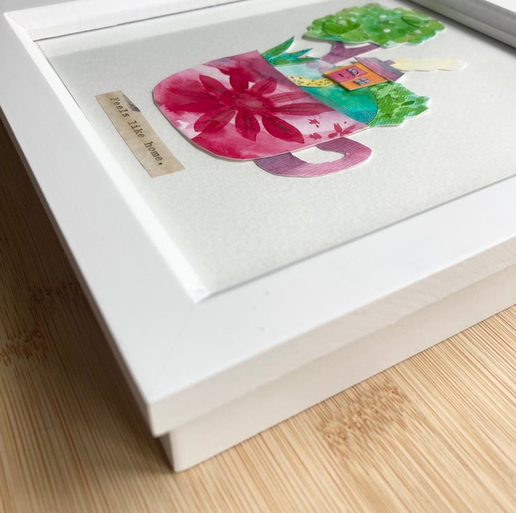This is a one of a kind, handcrafted piece of art that has been framed and is ready to hang. The chunky frame is wooden with a glass pane and is approximately 15 x 15cm.