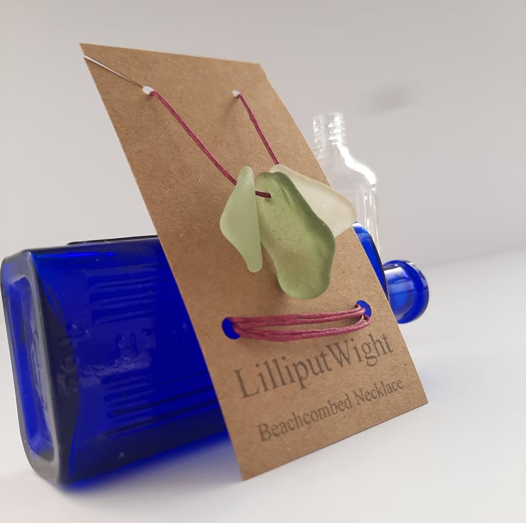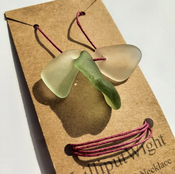 This necklace is made from naturally shaped pieces of sea glass. The sea frosted glass pieces have been suspended from a cord of dusty pink waxed cotton. A pair of sliding knots allow the length of the necklace to be adjustable and yet stay at the desired length.