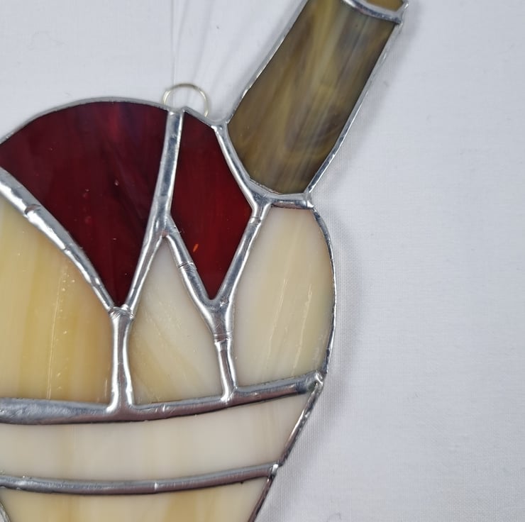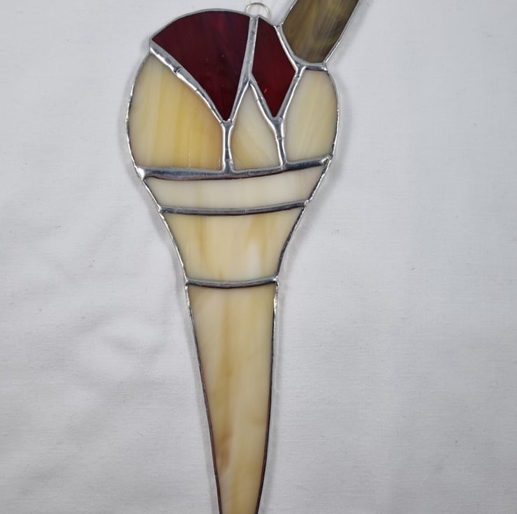My ice cream cone is made using cream, honey, red and brown glass and has a ring and invisible thread for hanging.