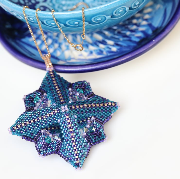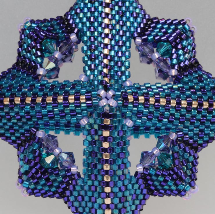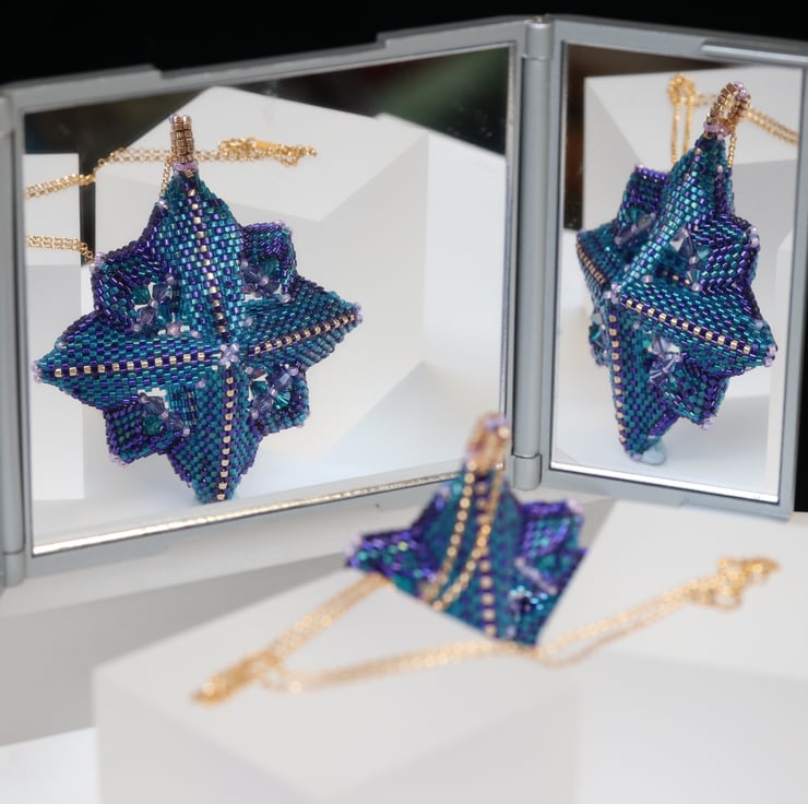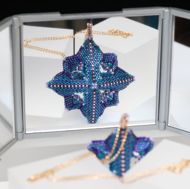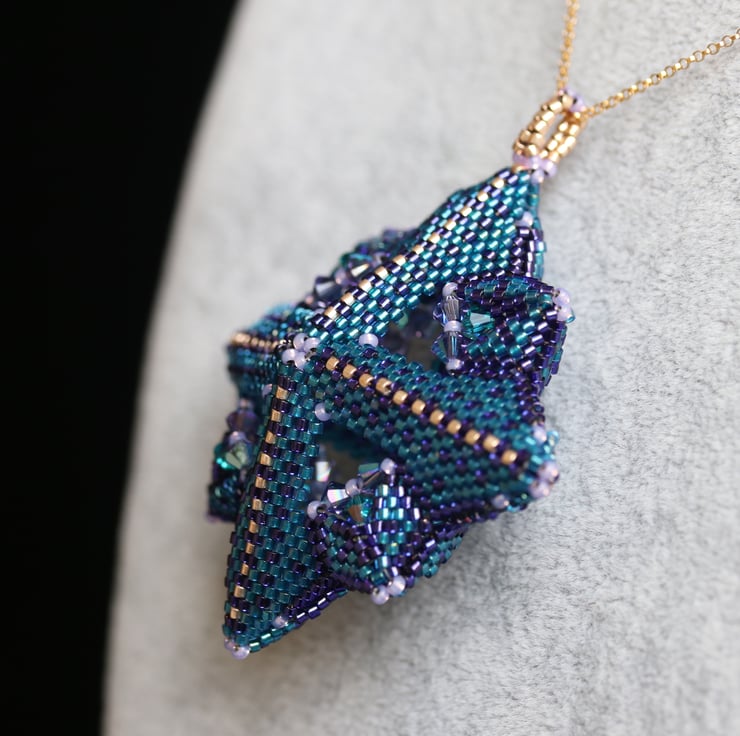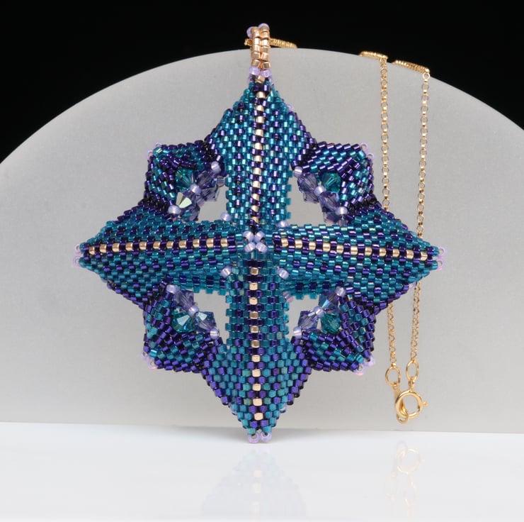 This very unusual pendant is double-sided; the same front and back. It is a hollow square shape with pretty chevron insets embellished with Swarovski crystals. Despite its size it is very lightweight due to its hollow structure and also the lightweight nature of the little glass delica beads from which it is made.