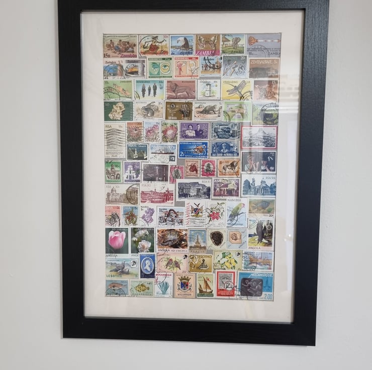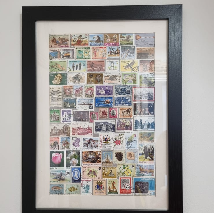 Every stamps are work of art, small or big. Not to mention the vintage items, all items are unique and our work of art will be unique for you. Comes all ready to hang on your chosen wall.