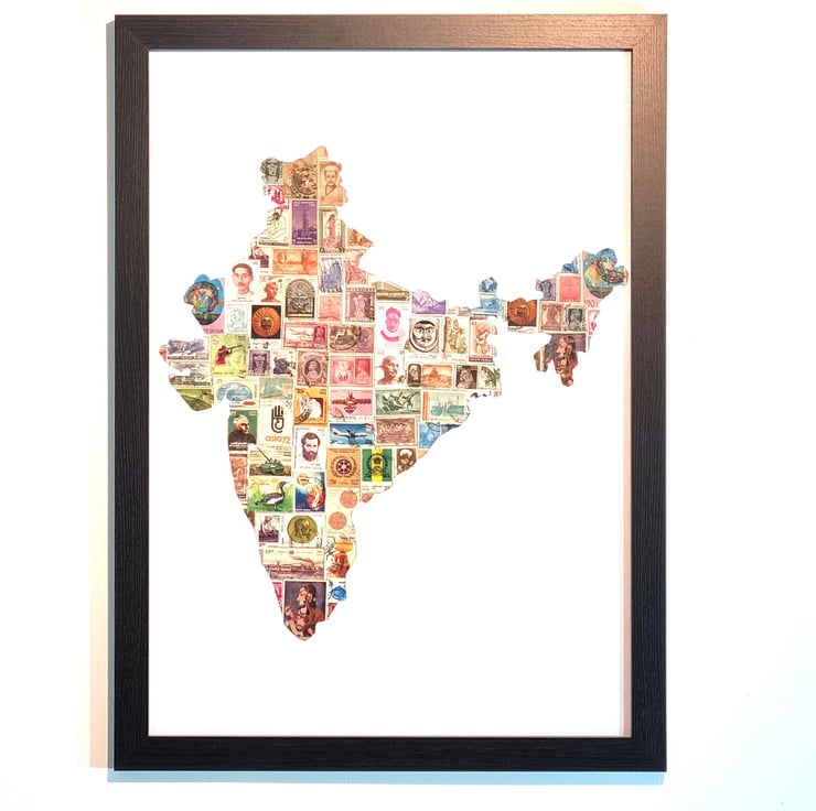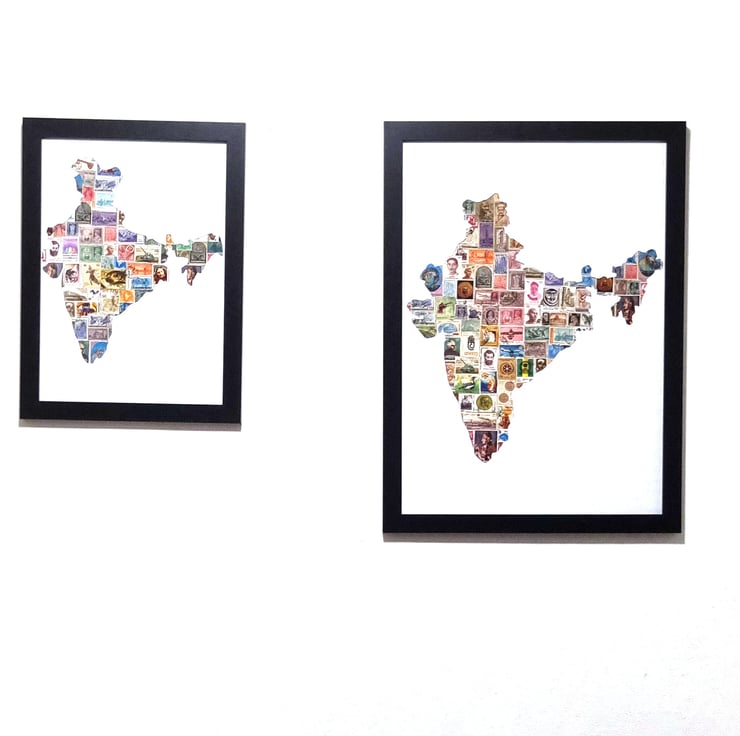 Indian postage stamp collections collage presented in a black frame. Each stamps are unique and they are lovely piece of art on its own. We are making a collage type artefact for wall dcor and making for an iconic and eye-catching centre piece for any living-room, office, or corridor.