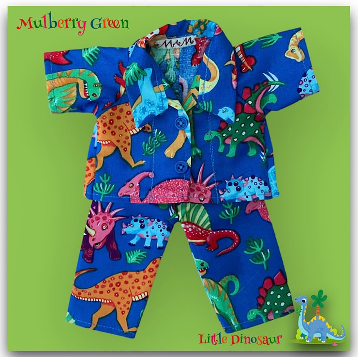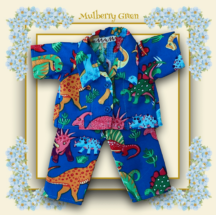 Cute little pyjamas in a dinosaur print, to fit the Mulberry Green characters. The pyjamas are made from best quality cotton and fasten at the front with two little poppers underneath the buttons.