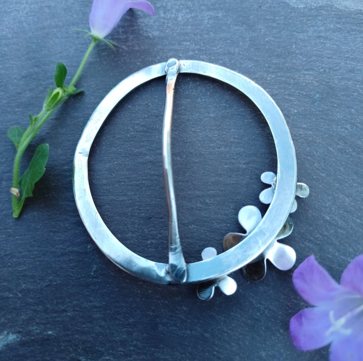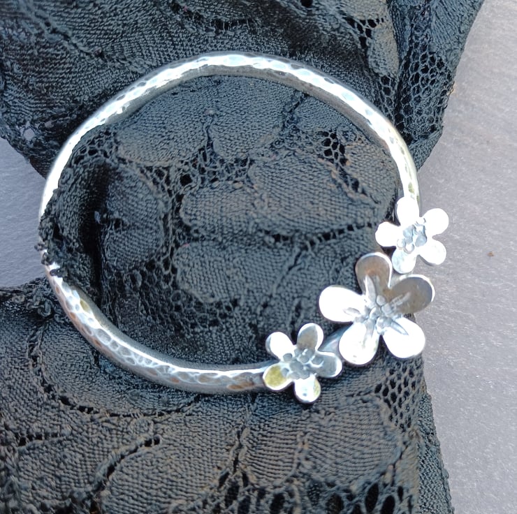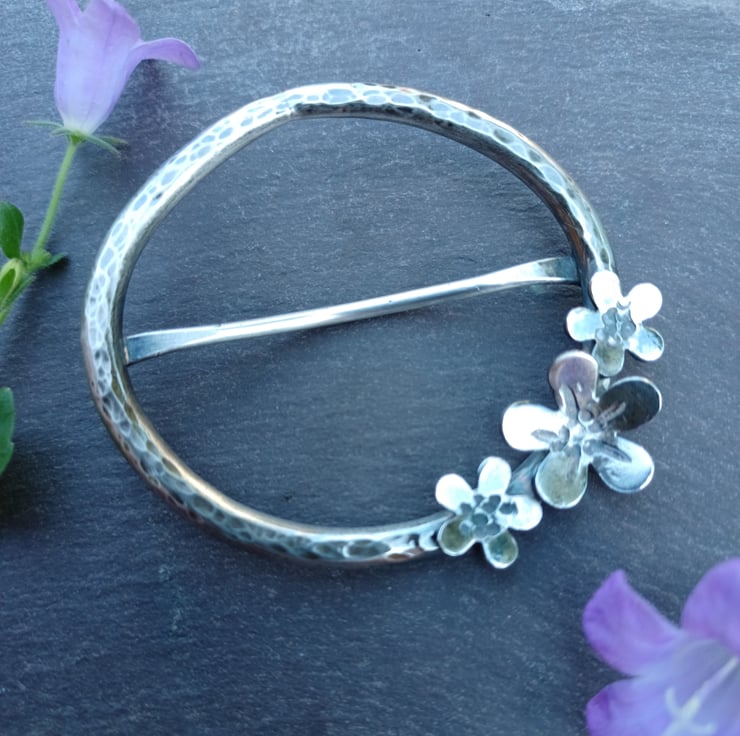 The scarf ring is an oval shape, 5.5cm x 4.75cm diameter. The largest flower is 1.5cm diameter; the other two are 0.75cm.