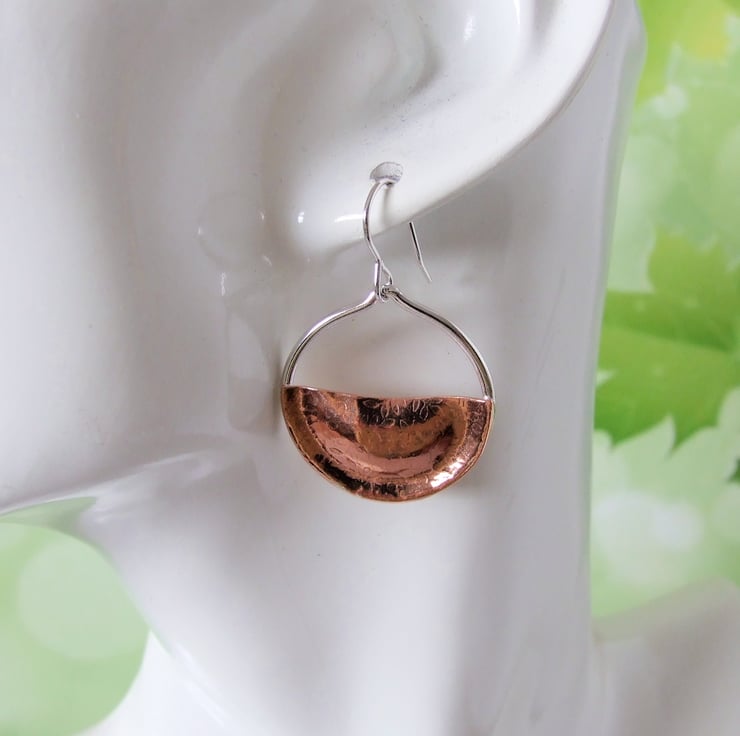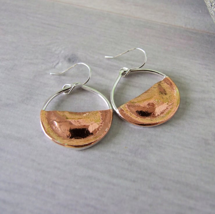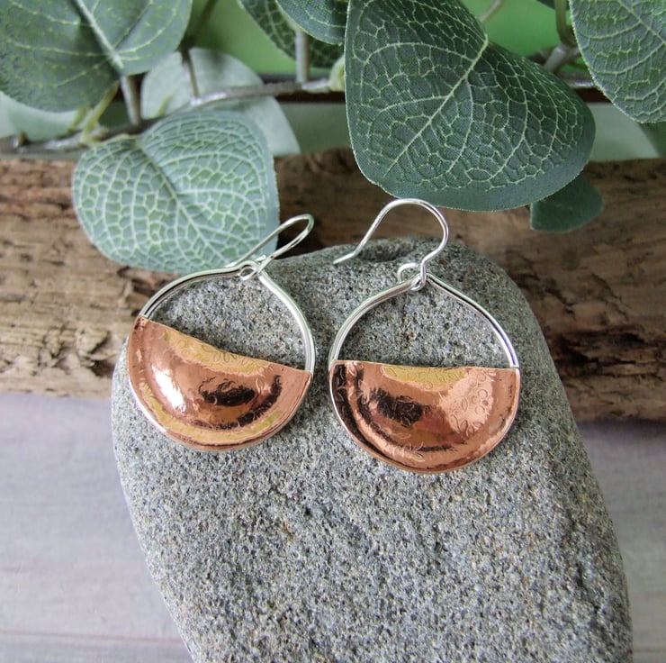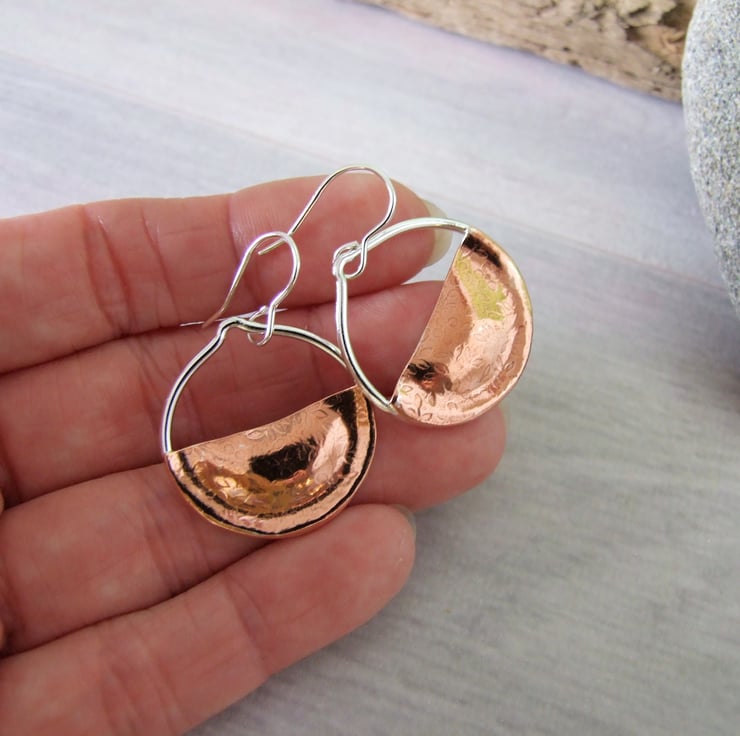 I have created the large circle shapes from sterling silver wire then cut two half circles from copper and textured with a floral pattern. As I have soldered the copper to the silver I have shaped it to look like it's been draped over for a soft sculptured look. Finished off with sterling silver ear hooks.