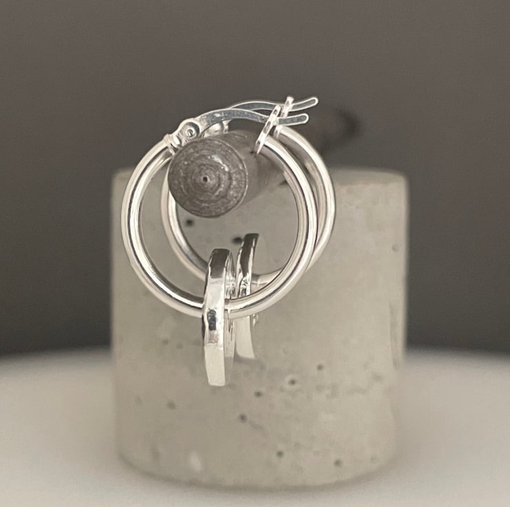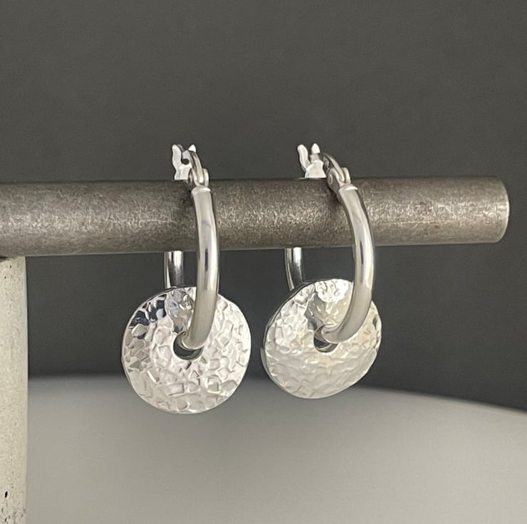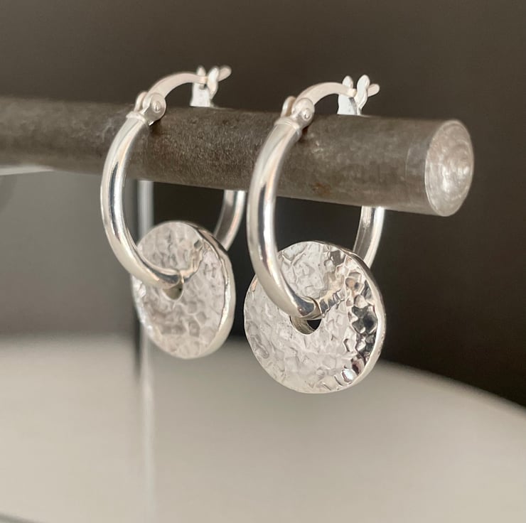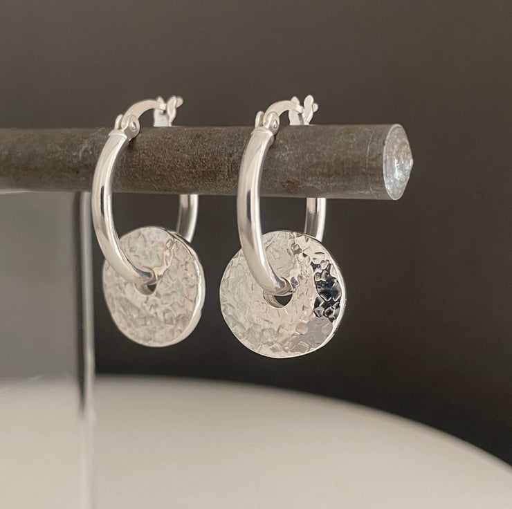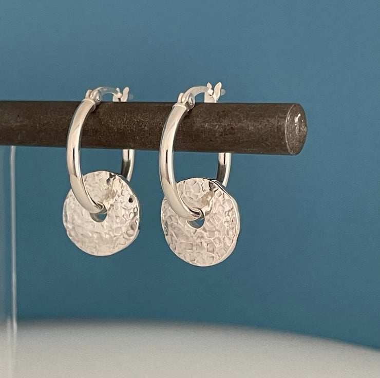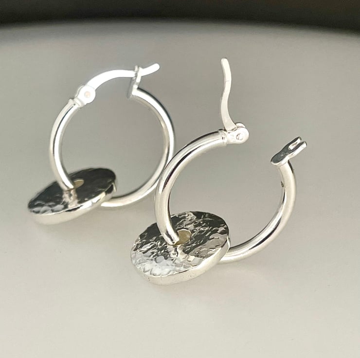 A lovely pair of pebble bead hoop earrings handmade from recycled 925 sterling silver. Two equal weights of silver are melted, hand forged into 2mm thick flat pebble shaped beads then hammered to create their attractive sparkly textured surface. Through drilled holes in the centre the pebbles are threaded onto thick plain silver creole lever hoop earrings