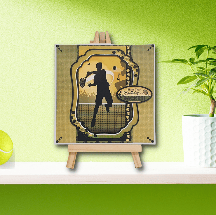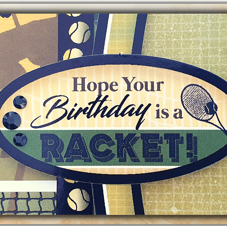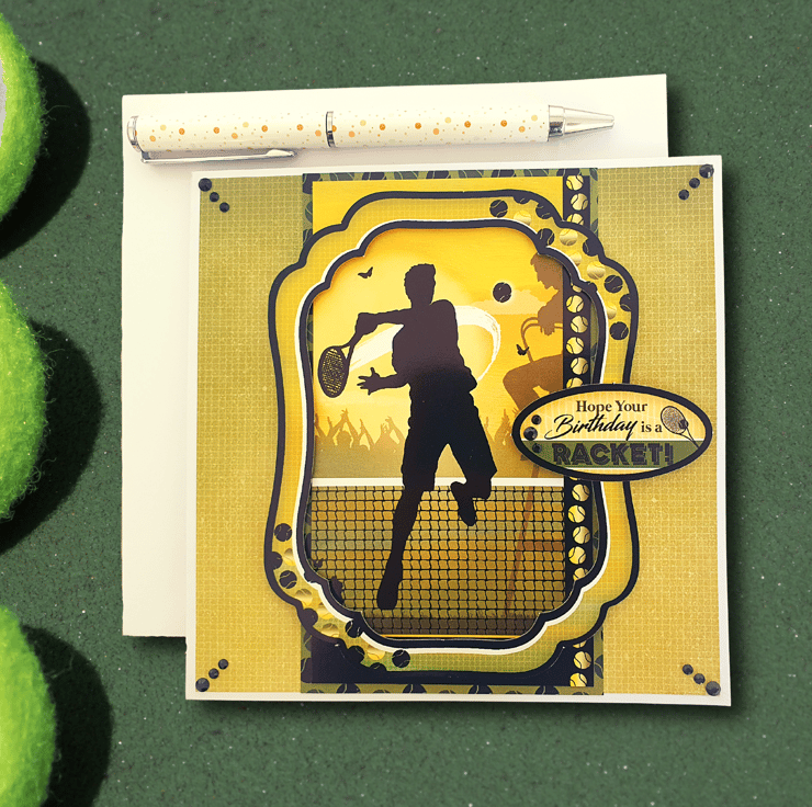 The decorative panel displaying a person's silhouette playing tennis lays in the middle of the card, and is surrounded with a 300gsm matching decorative frame. A smaller topper with the sentiment "Hope Your Birthday Is A Racket!" decorates the right side of the panel.