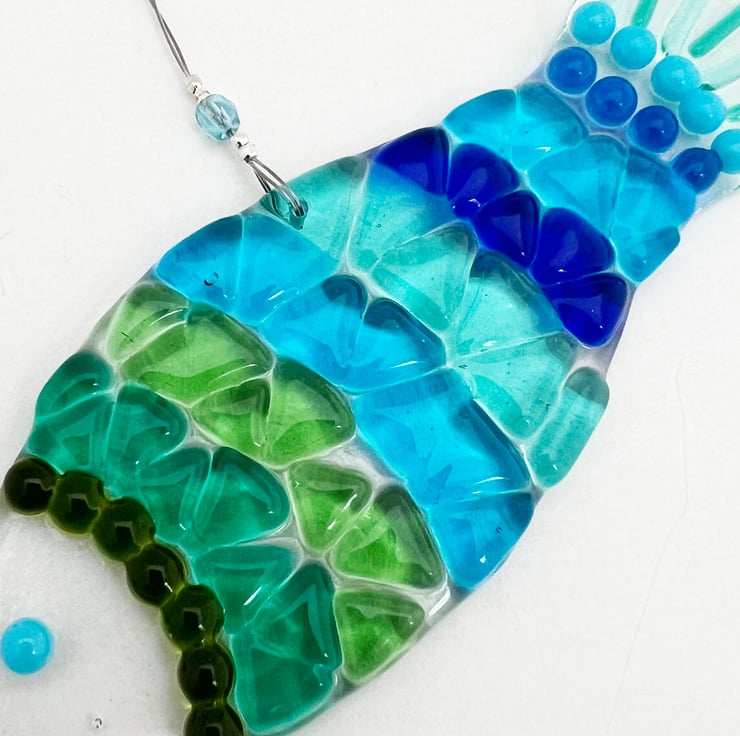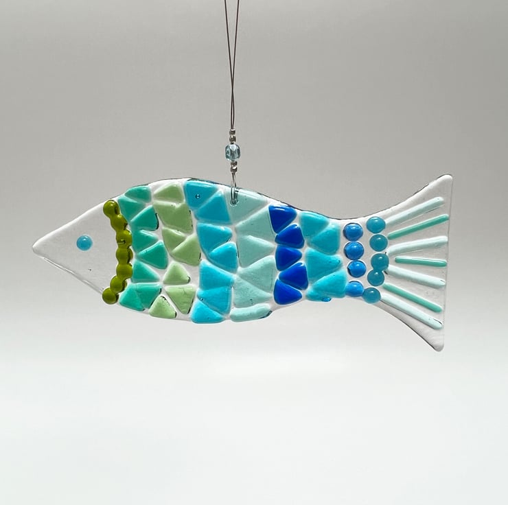 Fused glass hanging fish suncatcher. This fish has a transparent body decorated with a mosaic of different turquoise and green glass shapes. It looks lovely in a window and would make a wonderful gift.