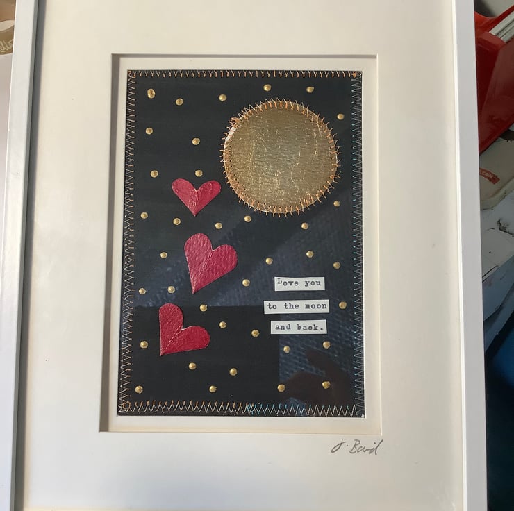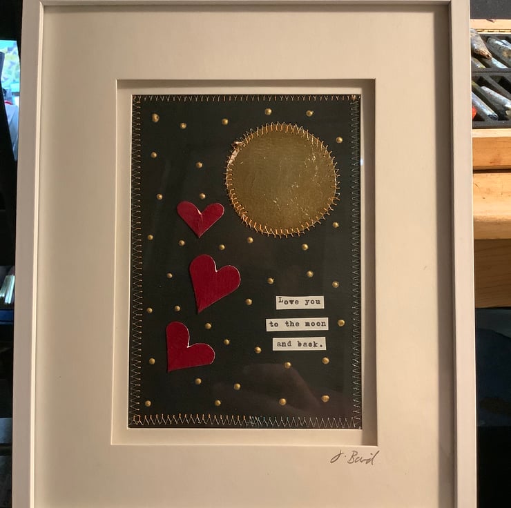 This picture has been handmade and framed in white. The moon is made from gold leaf and is stitched around the edges. The words read ‘love you to the moon and back’.
