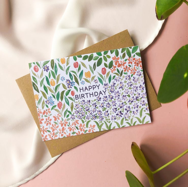 Wish someone a happy birthday with this gorgeous, eco-friendly card covered in colourful watercolour flowers including tulips & cosmos, around the text 'Happy Birthday'. Printed on recycled paper, blank inside for your own message.