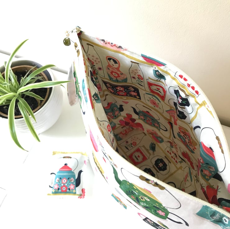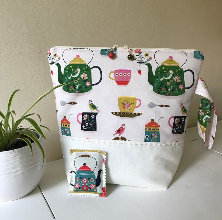 I have made this project bag out of beautiful tea themed cotton and stitched together with some lovely linen.