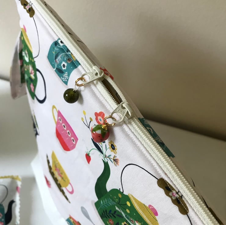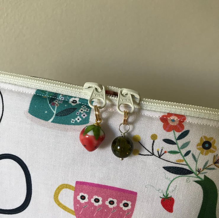 I have finished this bag with hand stitching and a strawberry zip charm for that beautiful finishing touch.