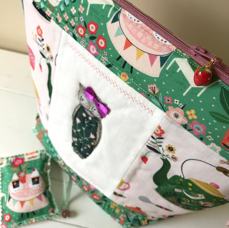 I have finished this bag with hand stitching and a strawberry zip charm for that beautiful finishing touch.