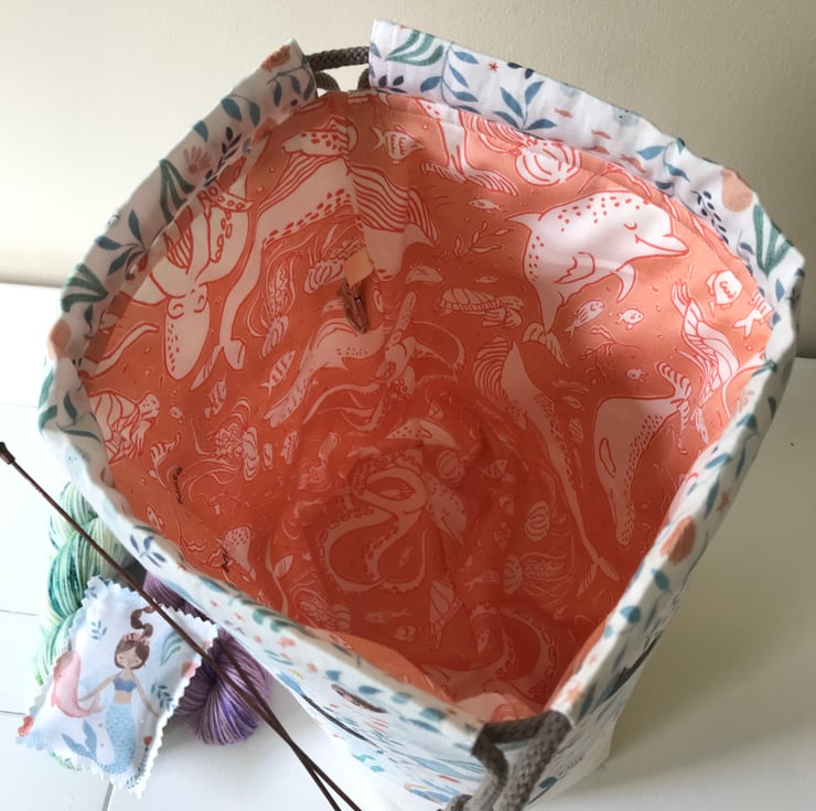I have made this project bag out of beautiful mermaid (there are Narwhals too) cotton and stitched it together with some lovely linen.