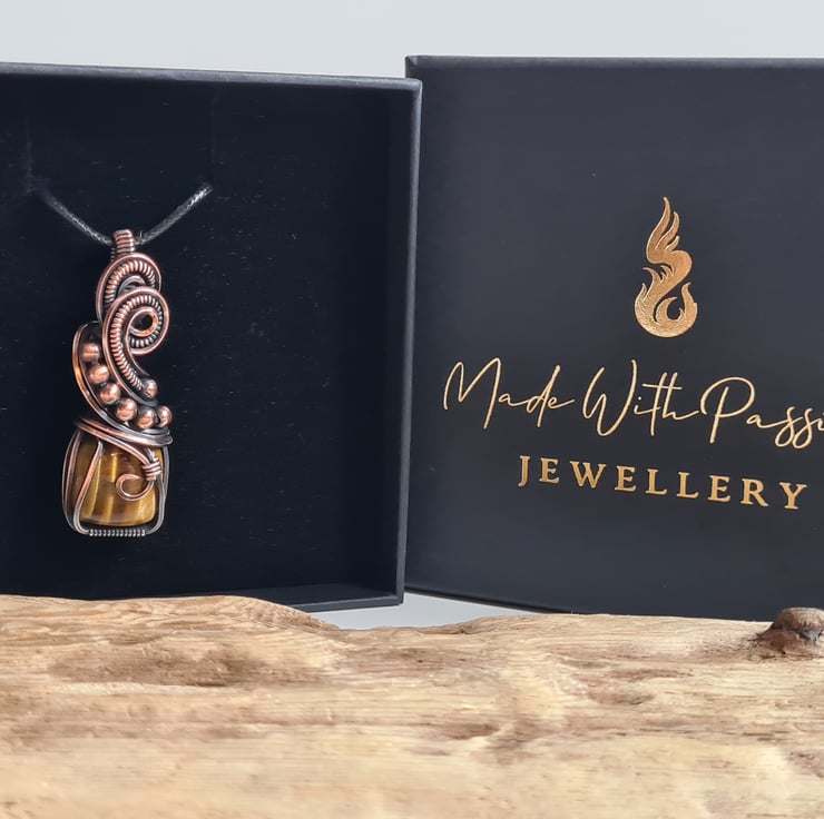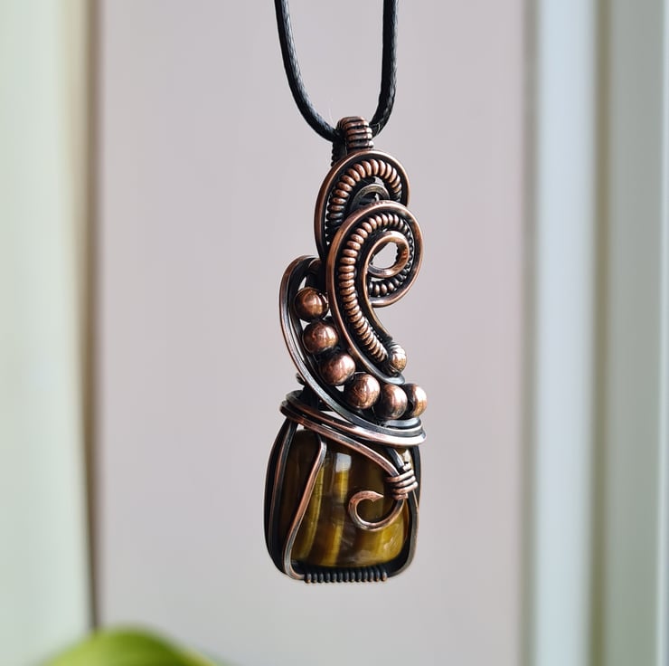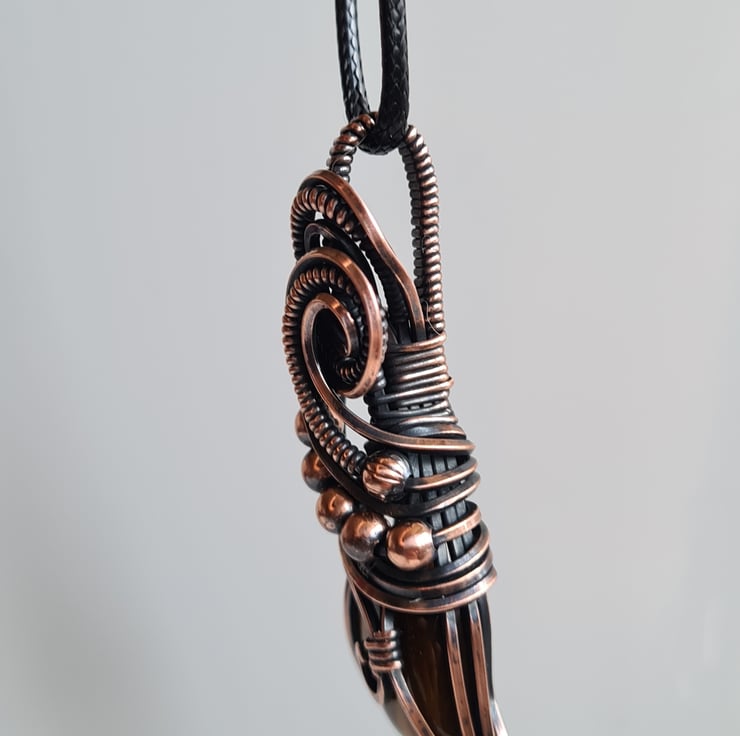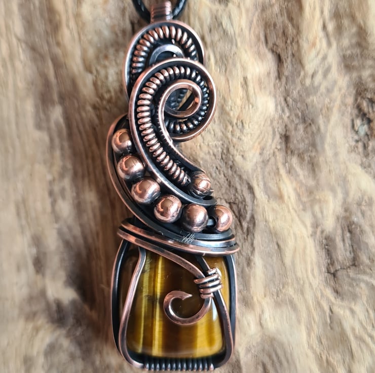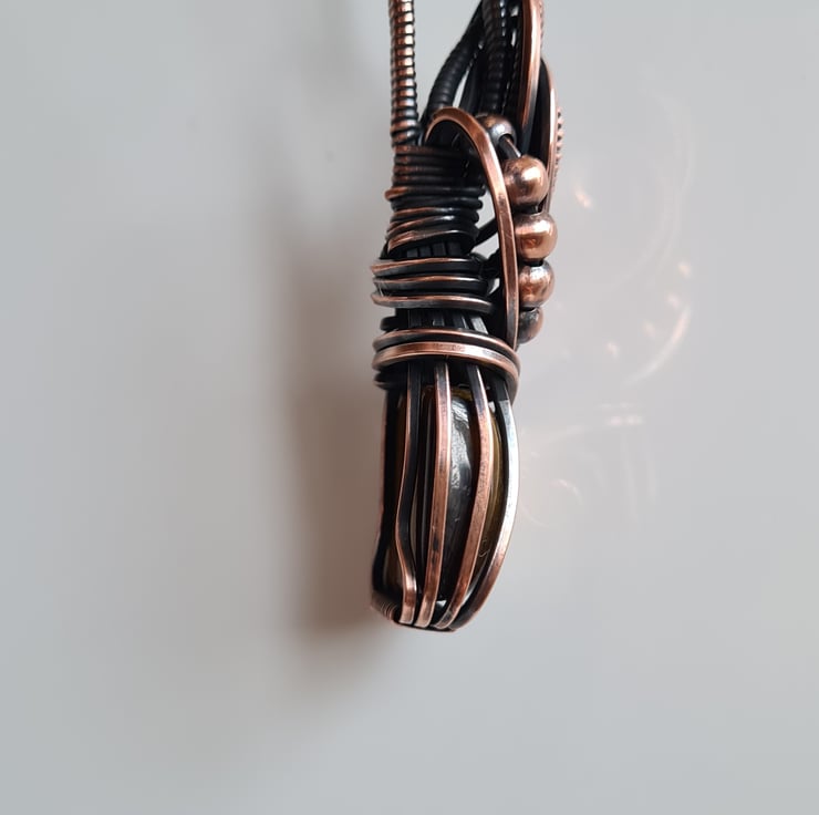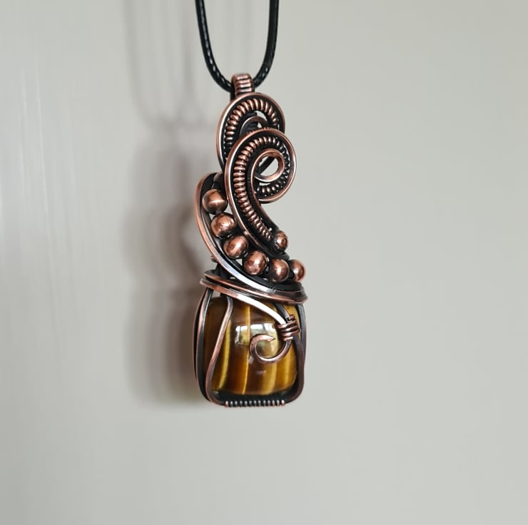 I have taken this really beautiful, top grade Natural Tiger's Eye stone and handwrapped it in raw copper, which I have then antiqued and polished for the final effect. This stone has lovely flash and depth of colour with a great stripe pattern to it.