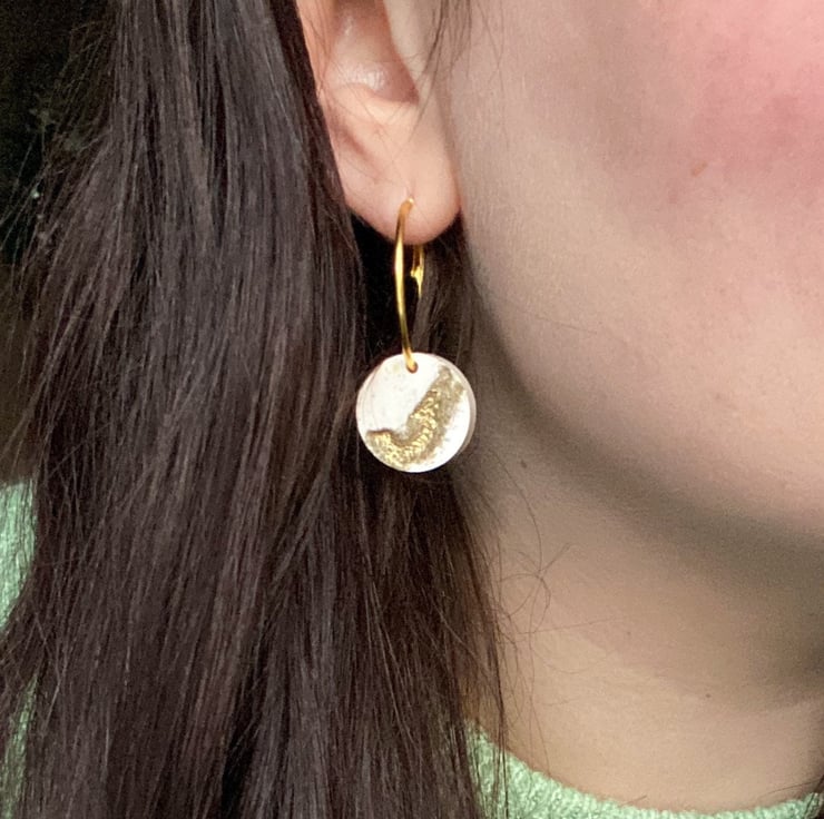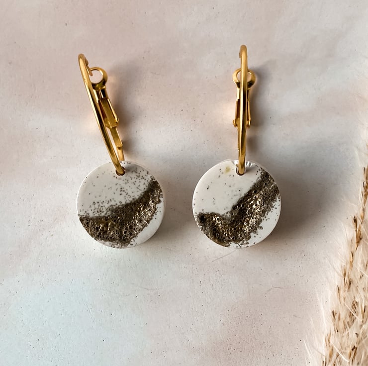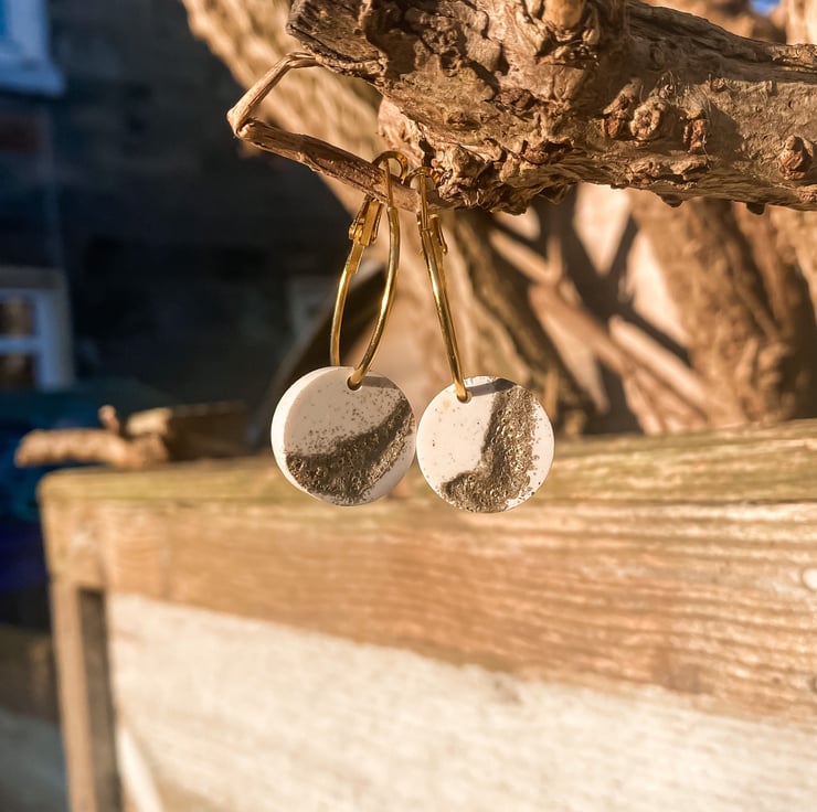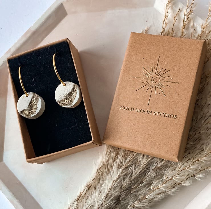 White Jesmonite earrings, handmade with a unique gold embossed design. Finished on gold plated hoops with clasps. Incredibly beautiful as a gift to a loved one or a treat to yourself.
