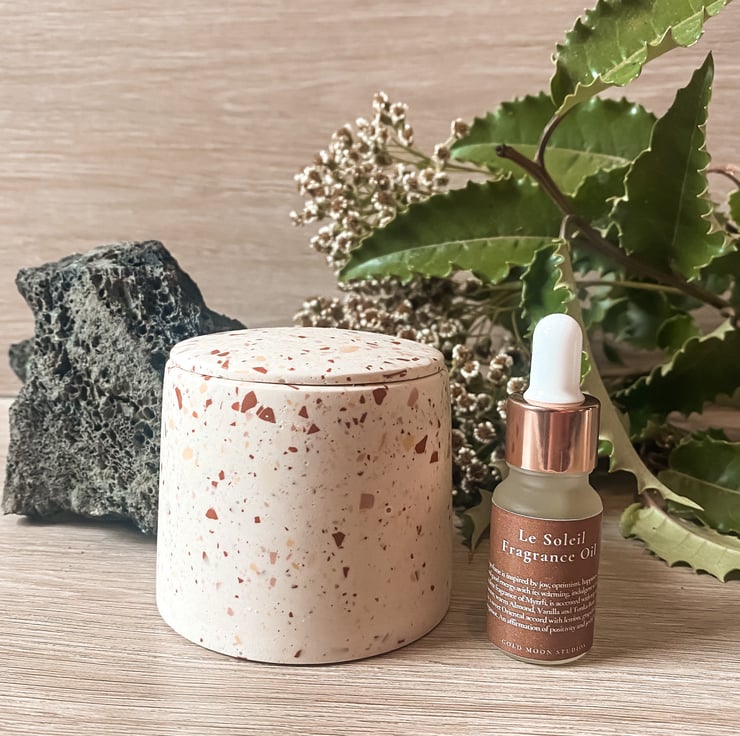 Our handmade jesmonite vessel is filled with lava stones, an earthy and intense volcanic mineral, created from molten lava which has solidified quickly under intense pressure and heat. This lava rock diffuser is an incredibly easy to way to diffuse your fragrance without power or water.