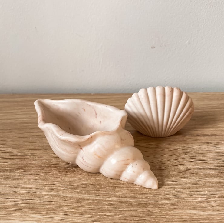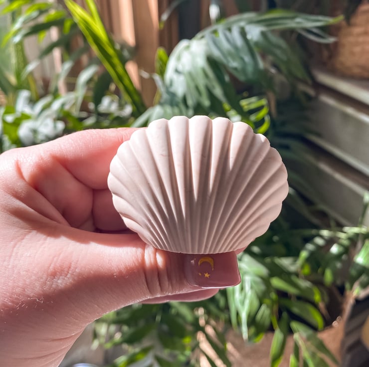 This is our small oyster shell decoration in marble quartz, a mix of pink and nude colours.