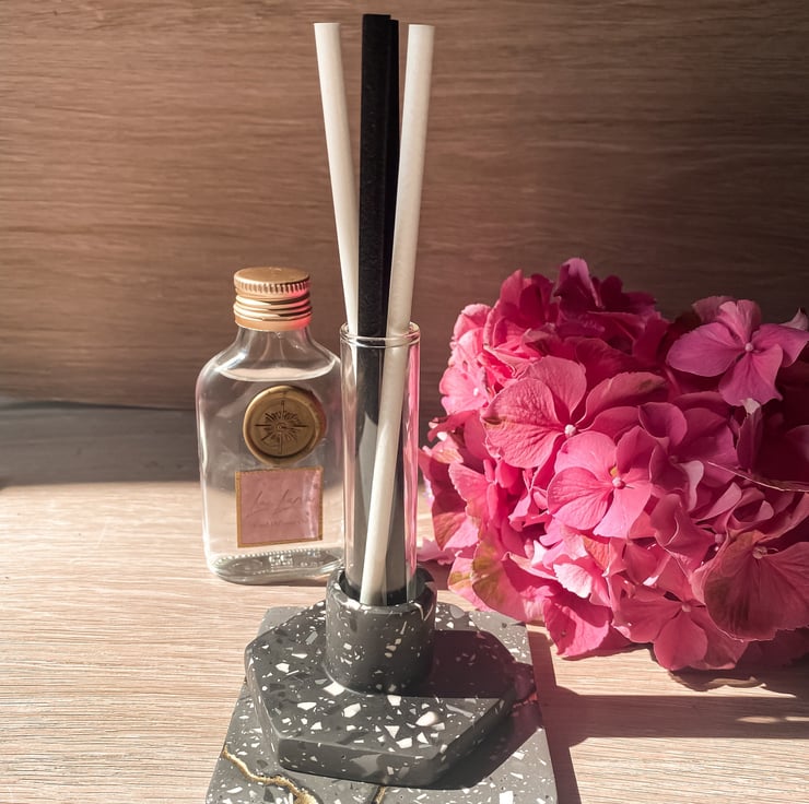 Our handmade jesmonite and glass vessel comes with 4 chunky reed diffuser sticks and a 100ml bottle of diffuser oil in a scent of your choice. The 100ml bottle will re-fill your diffuser up to 4 times meaning this set will provide up to 6 months of fragrance in your home.
