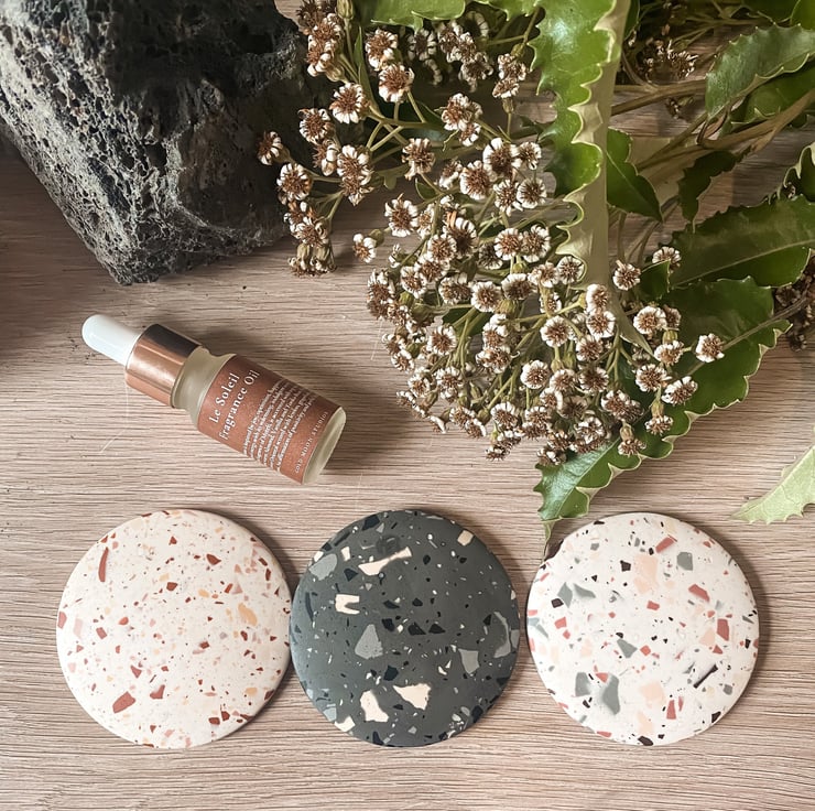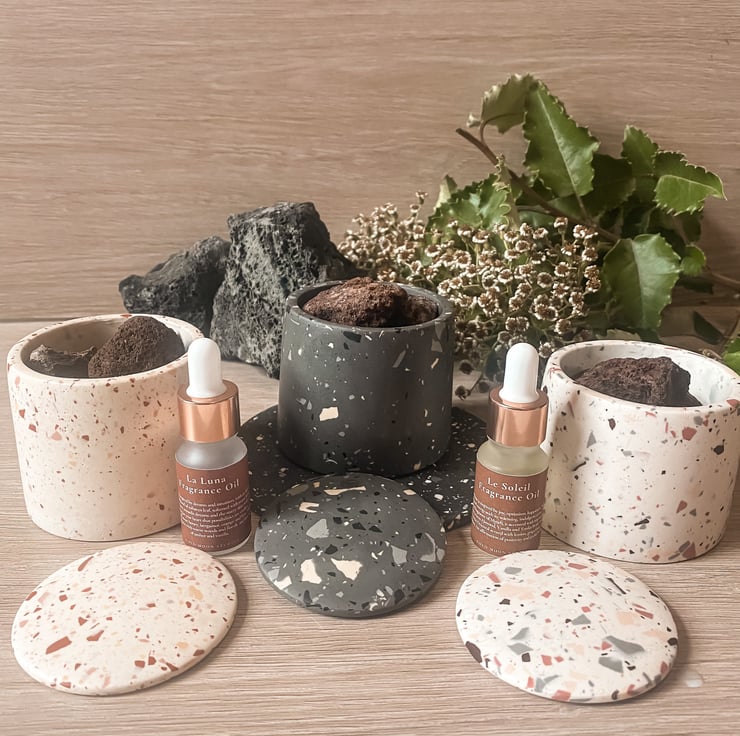 Our handmade jesmonite vessel is filled with lava stones, an earthy and intense volcanic mineral, created from molten lava which has solidified quickly under intense pressure and heat. This lava rock diffuser is an incredibly easy to way to diffuse your fragrance without power or water.