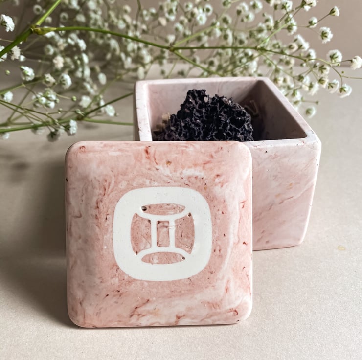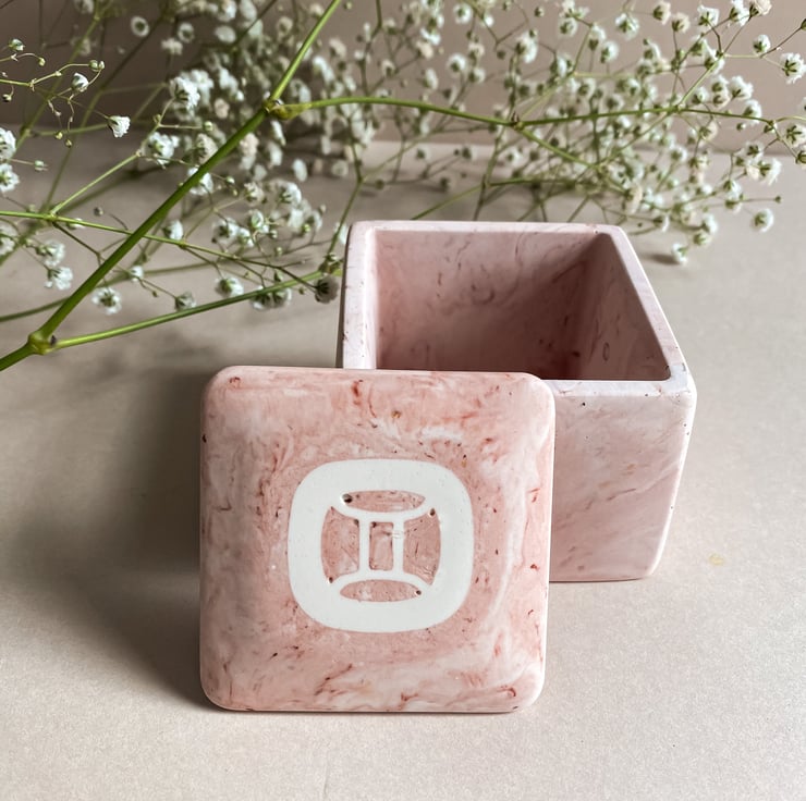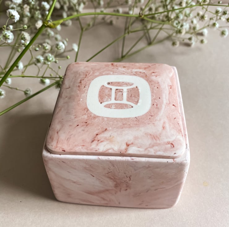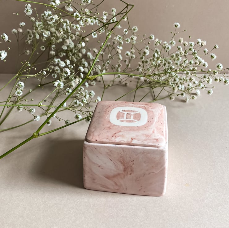 The jars are square in shape and come in our popular Marble Quartz colour way (a beautiful mix of soft pinks, nudes and golds) with your choice of zodiac sign embedded in the lid. They are a unique and beautiful birthday or housewarming gift for a loved one or special treat to yourself.