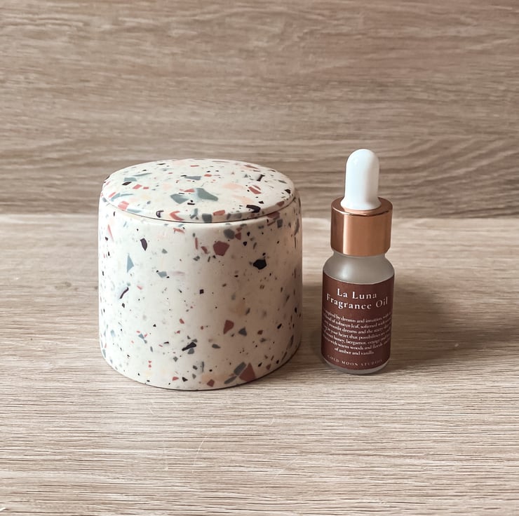 Here at Gold Moon Studios we hand craft beautiful jars out of Jesmonite, an eco friendly resin. We can then fill them with beautiful soy candles or lava rock diffusers but they also make cute storage jars for around your home.