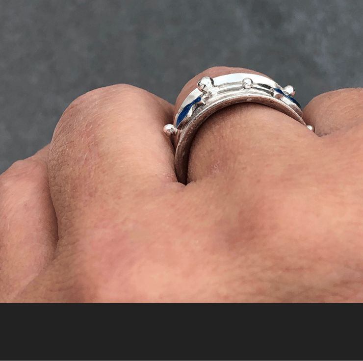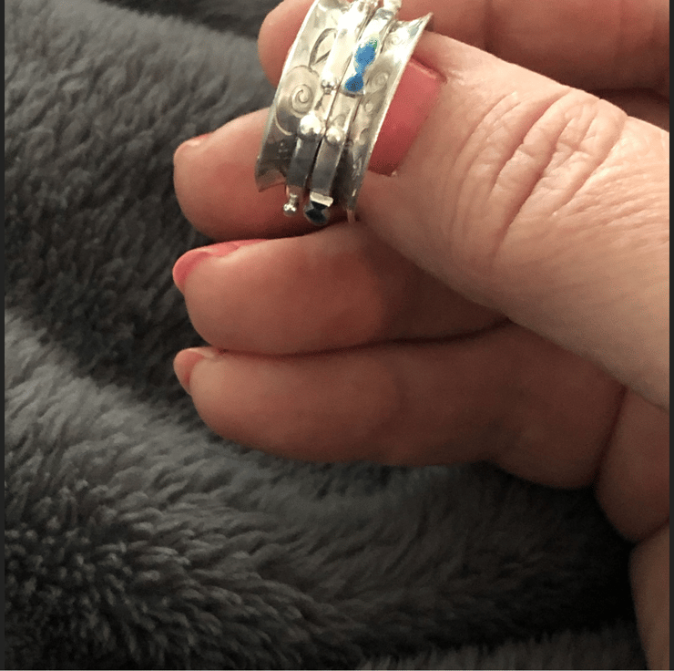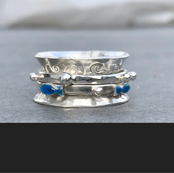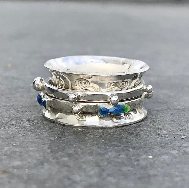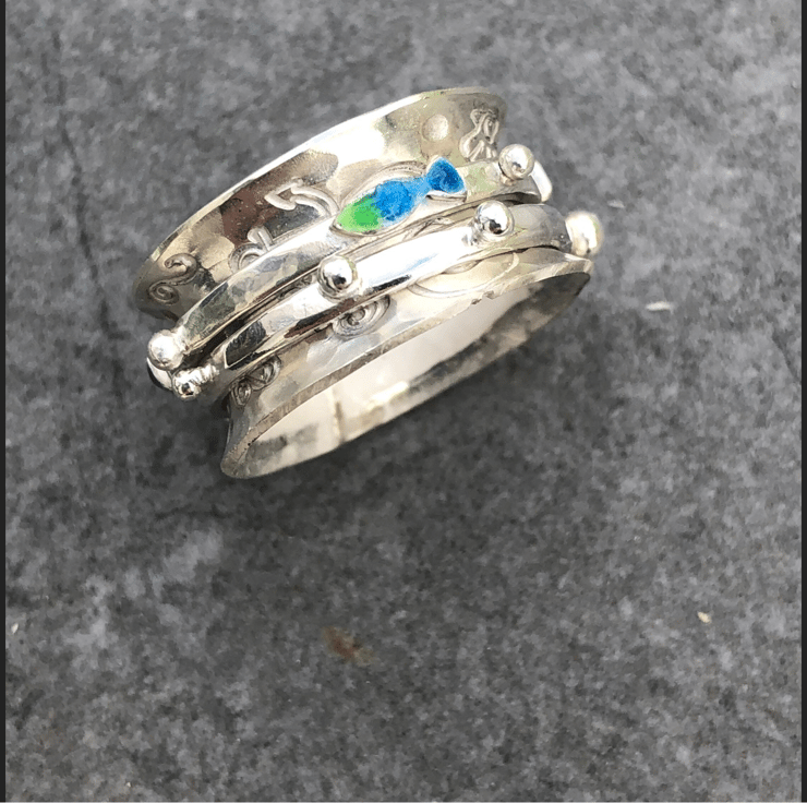 This Fish Spinner ring is made from Sterling silver, Fine silver and Enamel. The ring has two themed, narrow inside rings that spin around the approximately 9mm wide curved edge band. One of the inside rings has fine silver ‘bubbles’ all the way around and the second has silver ‘bubbles’ along with three blue and turquoise enamelled fish. Underneath the two rings is a patterned ‘sea’ themed surface: shells, star fish, fish and waves etc. The whole ring measures approx: 9mm in width.