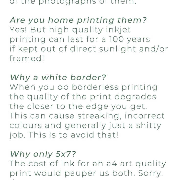 Once the pre-order week has finished (8th of July) I will print everyone's specific orders so I'm not wasting ink and can guarantee that when the shop opens (early August), people will have their prints ready to go with the rest of their order.
