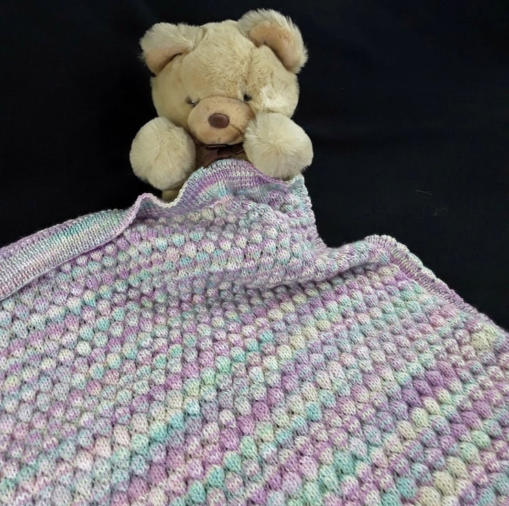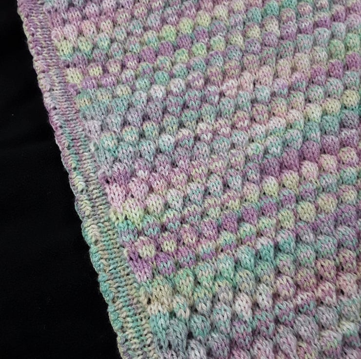 Hand-Knitted Baby Pram Blanket in Multicoloured Bobble Design—an adorable accessory that combines comfort and style for your little one during spring outings. This blanket is a labor of love, meticulously hand-knitted using a soft, multicoloured yarn aptly named 'Cherry Blossom,' evoking the vibrant hues of blooming cherry trees—blending shades of lilac, pink, and green in a harmonious dance of colors.