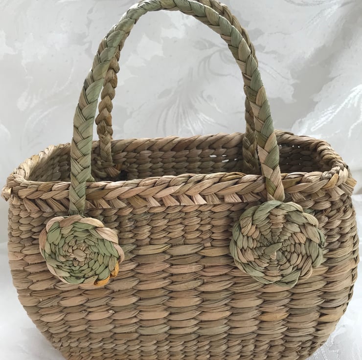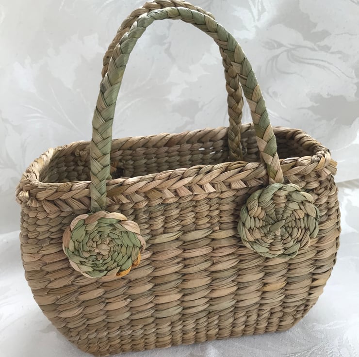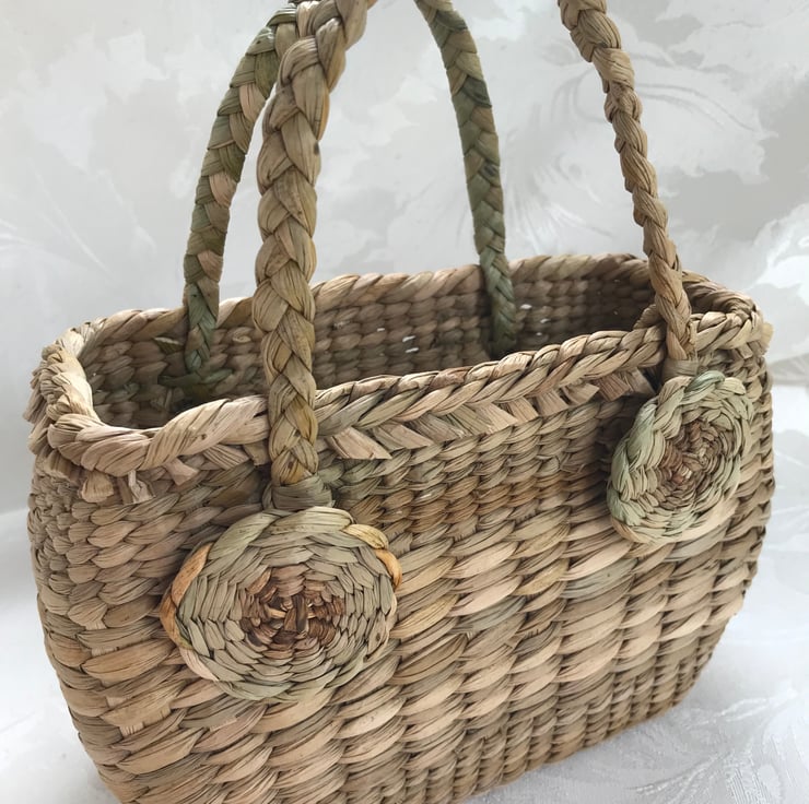 A very pretty, small rush basket/handbag/purse, beautifully hand-woven from hand-harvested Somerset rush. Simply woven in single and double-strand pairing, adorned with pretty rush buttons and finished off with 3-strand plaited handles.