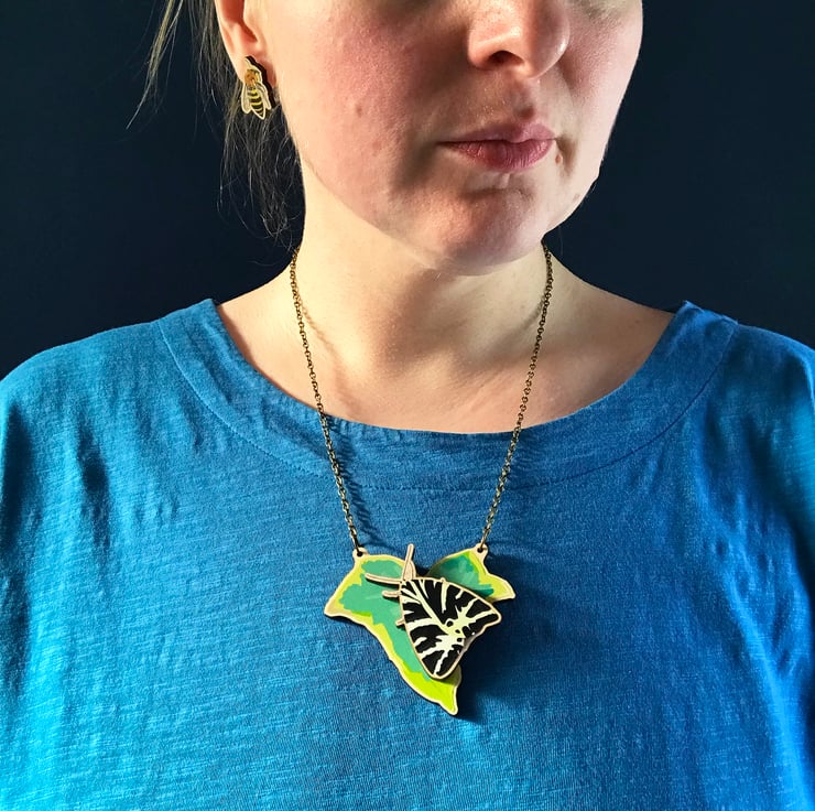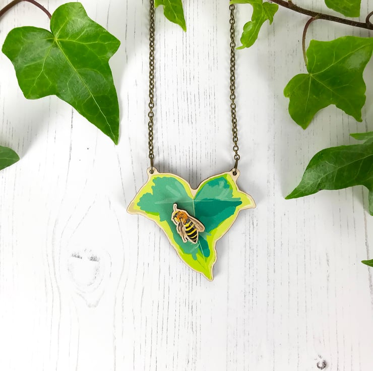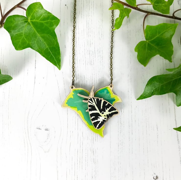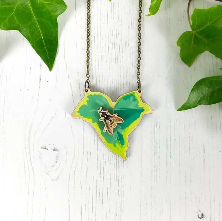 This small and lush green leaf attracts all kinds of beautiful insects and this time you can pick which you'd like, Jersey Tiger Moth, golden hoverfly or ivy mining bee. This bold vibrant necklace is perfect for nature lovers and insect fans. Sold in aid of Bug Life, 10% from each item of the Ivy League collection sold will be donated to Bug Life, a registered charity in England and Wales, number 1092293, and in Scotland, number SC040004.