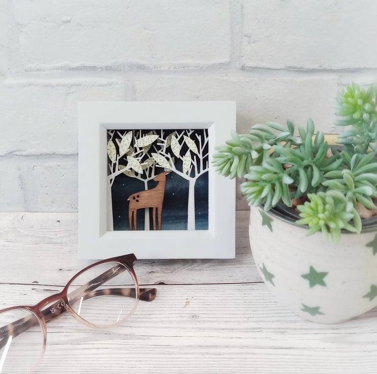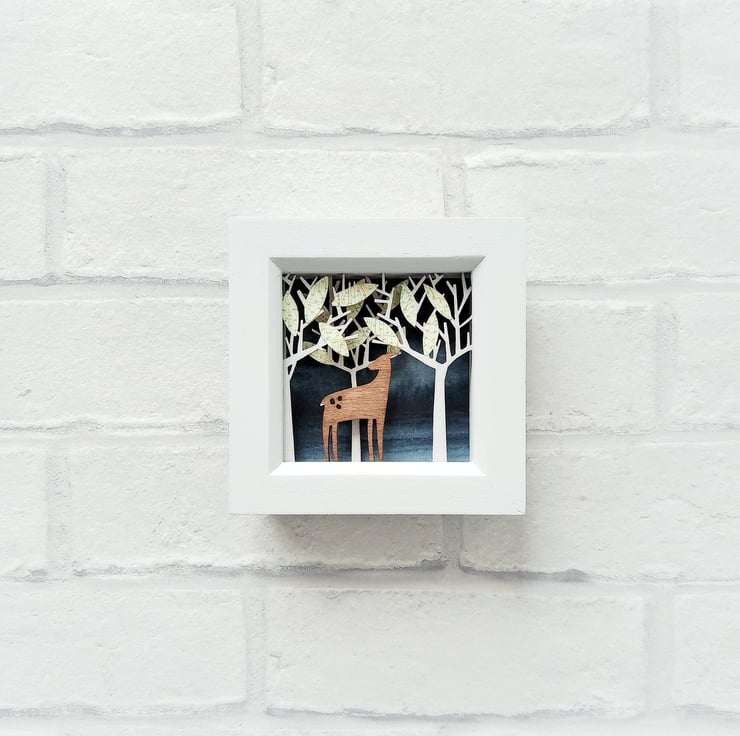 The design comes from original drawings which have been transformed into layers of laser cut wood, which I paint by hand and build up to form 3d layers. It is set into a glazed pale grey wooden box frame, which measures approx. 11cm; the scene itself measures 7.5cm x 7.5cm x 1.5cm.