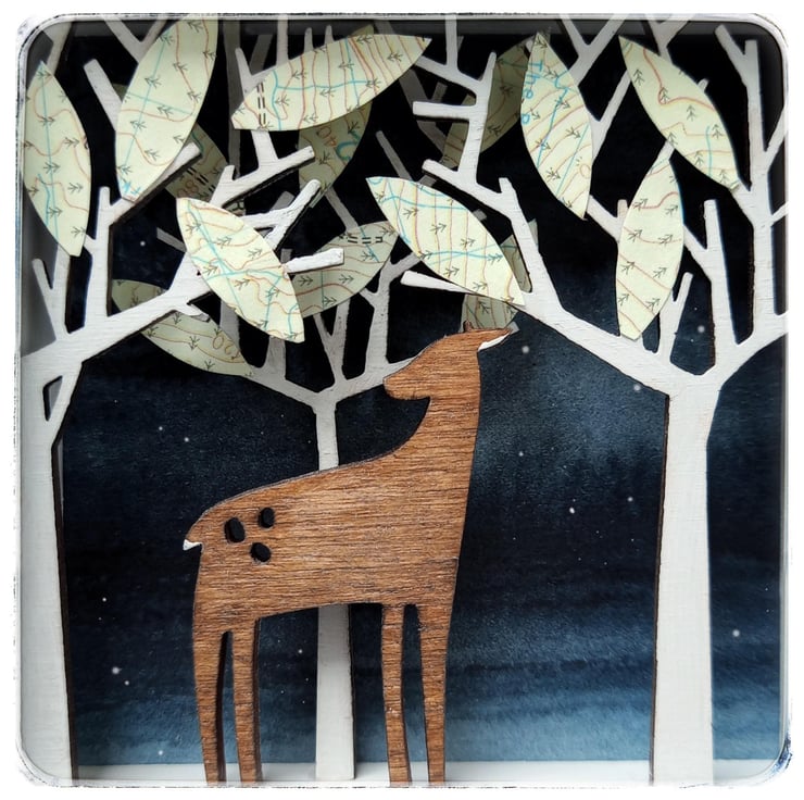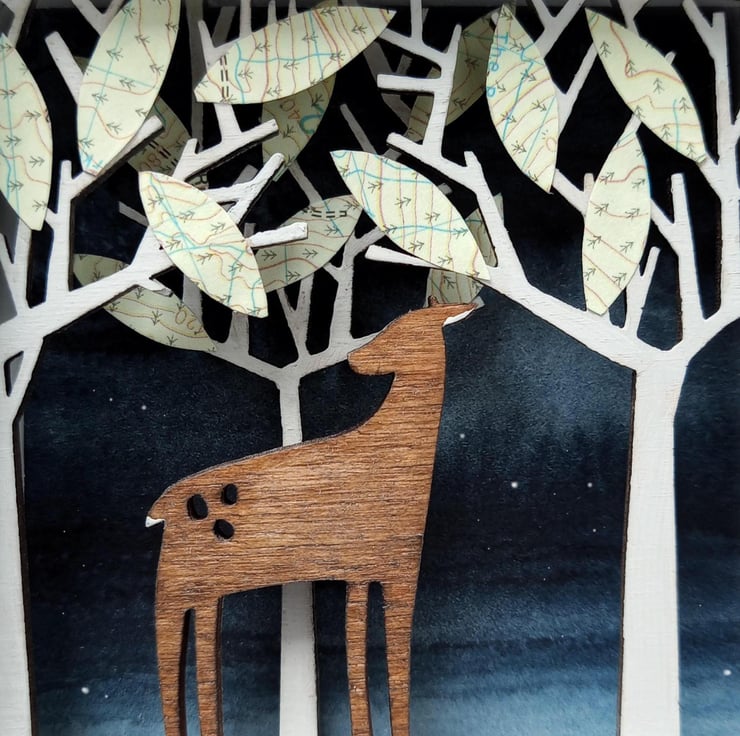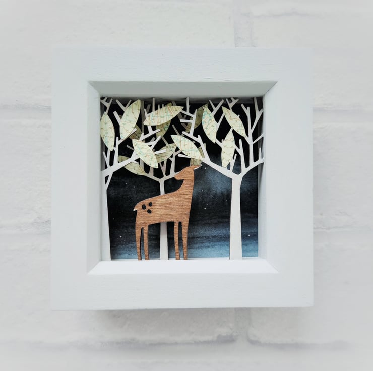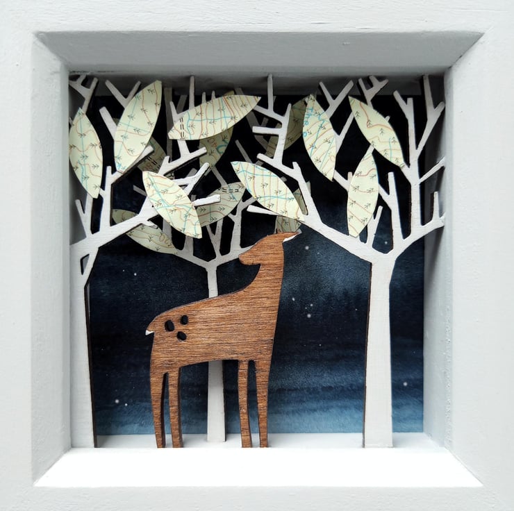 'Deer in the Forest' - this miniature diorama features a little deer roaming through woodland, with OS map leaves in the treetops. It is inspired by my love of animals and nature. Partly influenced by my time working on props and sets in the theatre, all my dioramas aim to create an alternative little world within a small contained space, something I've always been fascinated by!