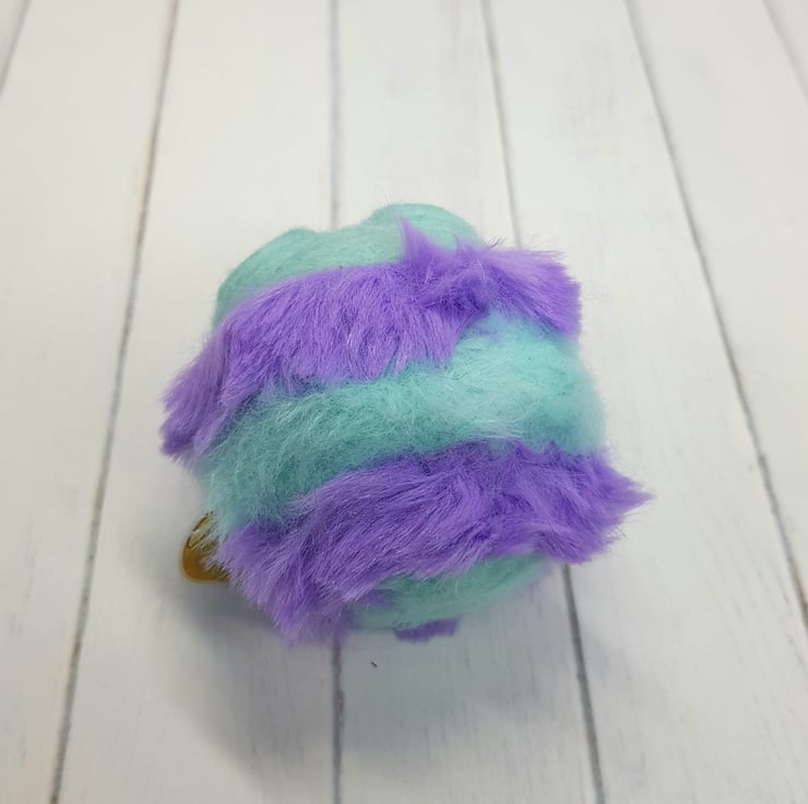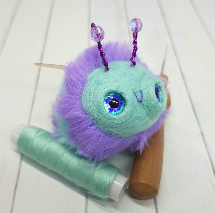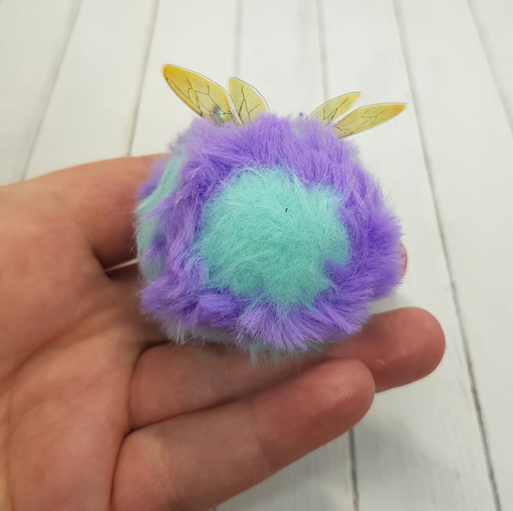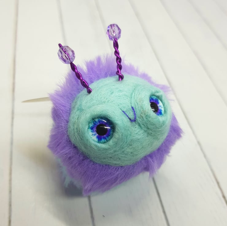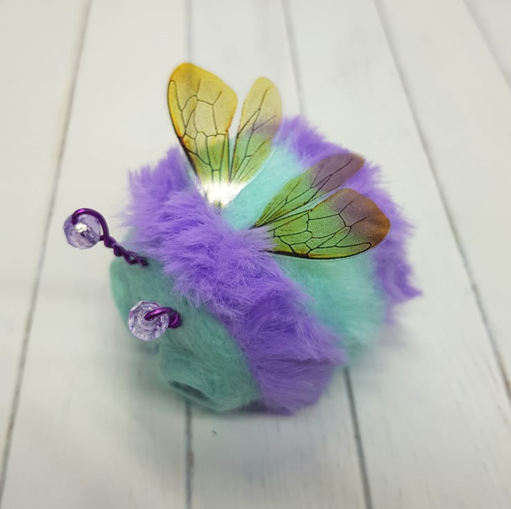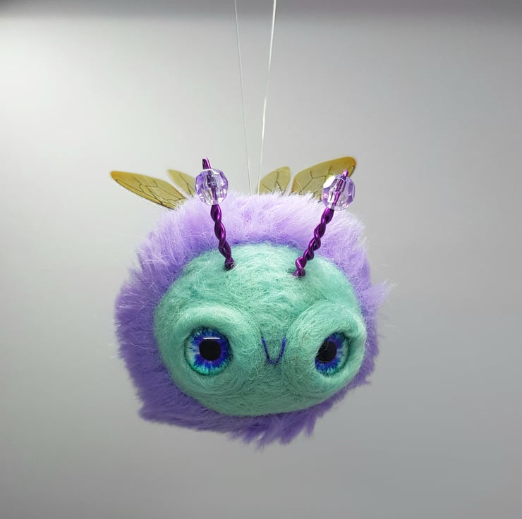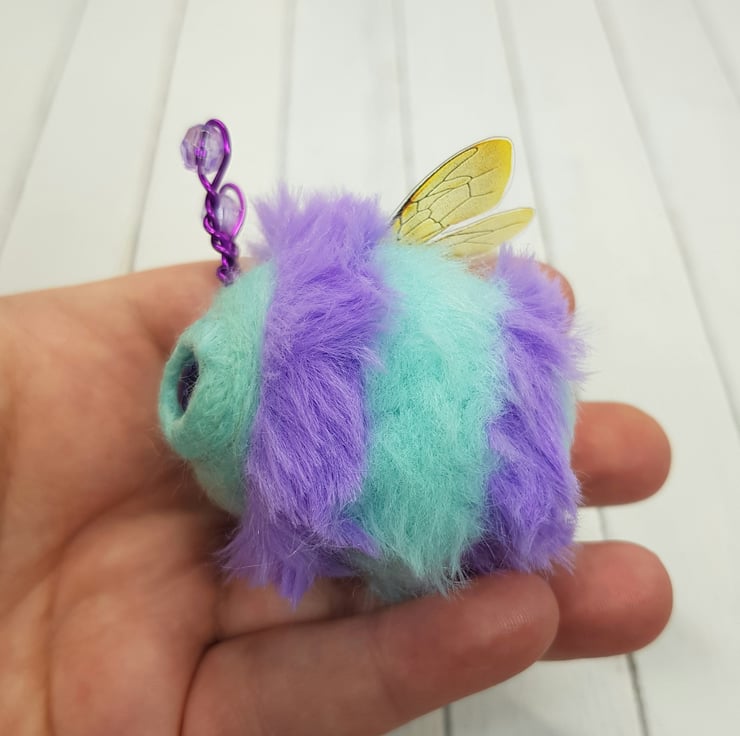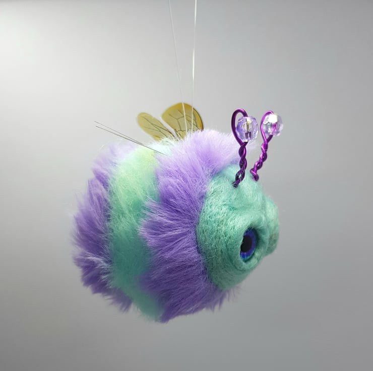 This cute round bee has a needle felted wool body with fun faux fur stripes hand stitched into place. The face is needle felted with a little smile and glass eyes are glued into place with a wool surround. The antenna are twisted coloured metal wire with a bead. The wings are shiny, printed, thin plastic hand cut and sewn into place with embroidery thread. Bee measures roughly 6cm long in the body and 7cm tall including antennae. This bee comes with a transparent loop hanger attached.