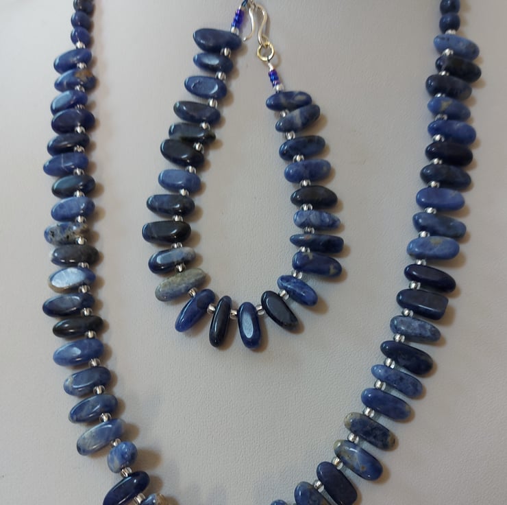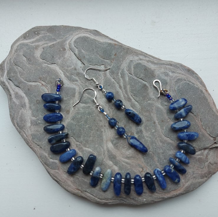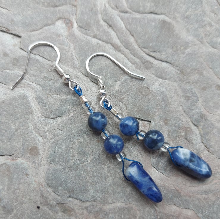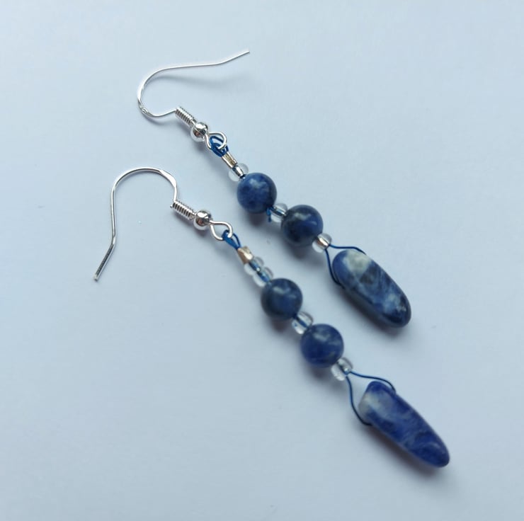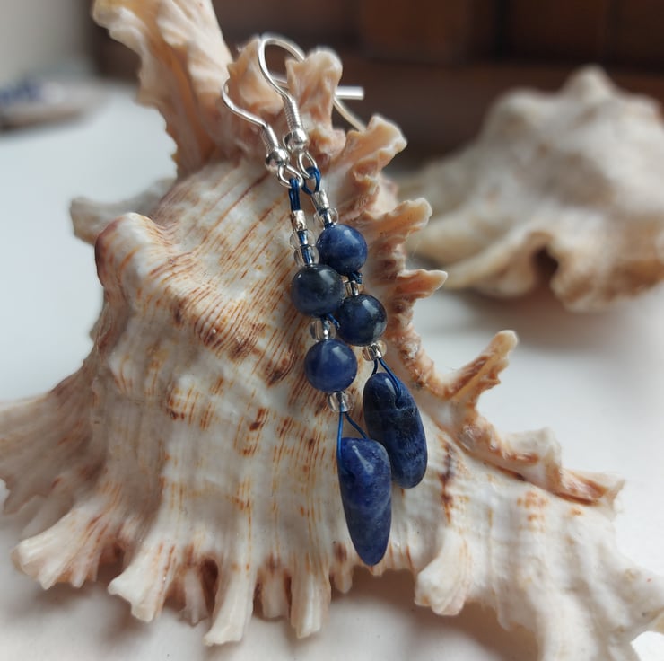 These versatile gemstone earrings may be bought on their own or as part of a 3-piece jewellery set. They feature sodalite beads in a pretty dark blue denim shade, together with clear Czech crystal beads, lined with silver for a touch of sparkle. The focal bead at the bottom is a rectangular nugget of sodalite measuring about 10x4mm. Above this are two round sodalite beads, 6mm in diameter. The beads are threaded onto beading wire attached to ear hooks stamped 925 for sterling. The drop below the hook is about 4cm.