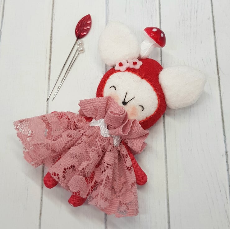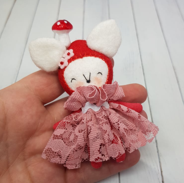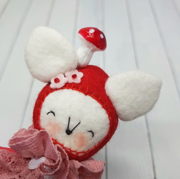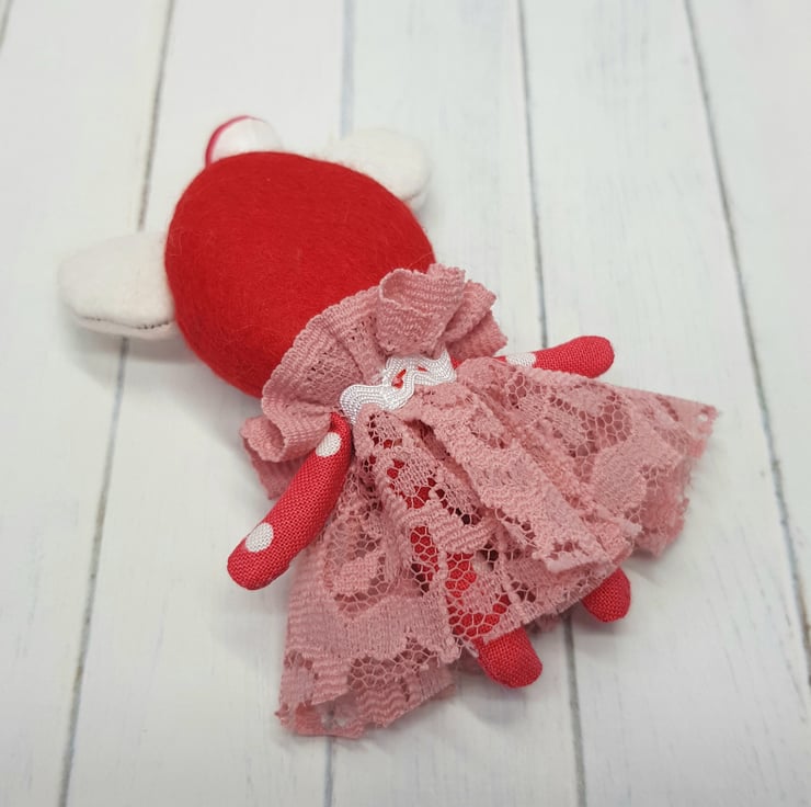 Miniature felt art doll wearing a lace dress. Doll has hand embroidered face and beaded felt flowers sewn into place. Doll has polka dot cotton arms and legs and a faux toadstool on it's hat. Doll measures roughly 10cm tall. This is for decorative purposes only and not a toy.