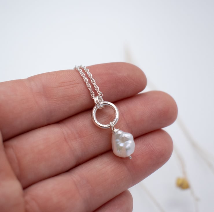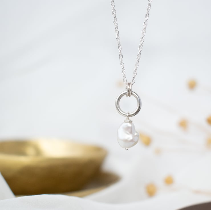 Pearl necklace featuring a single keishi pearl hung from a handcrafted silver ring.